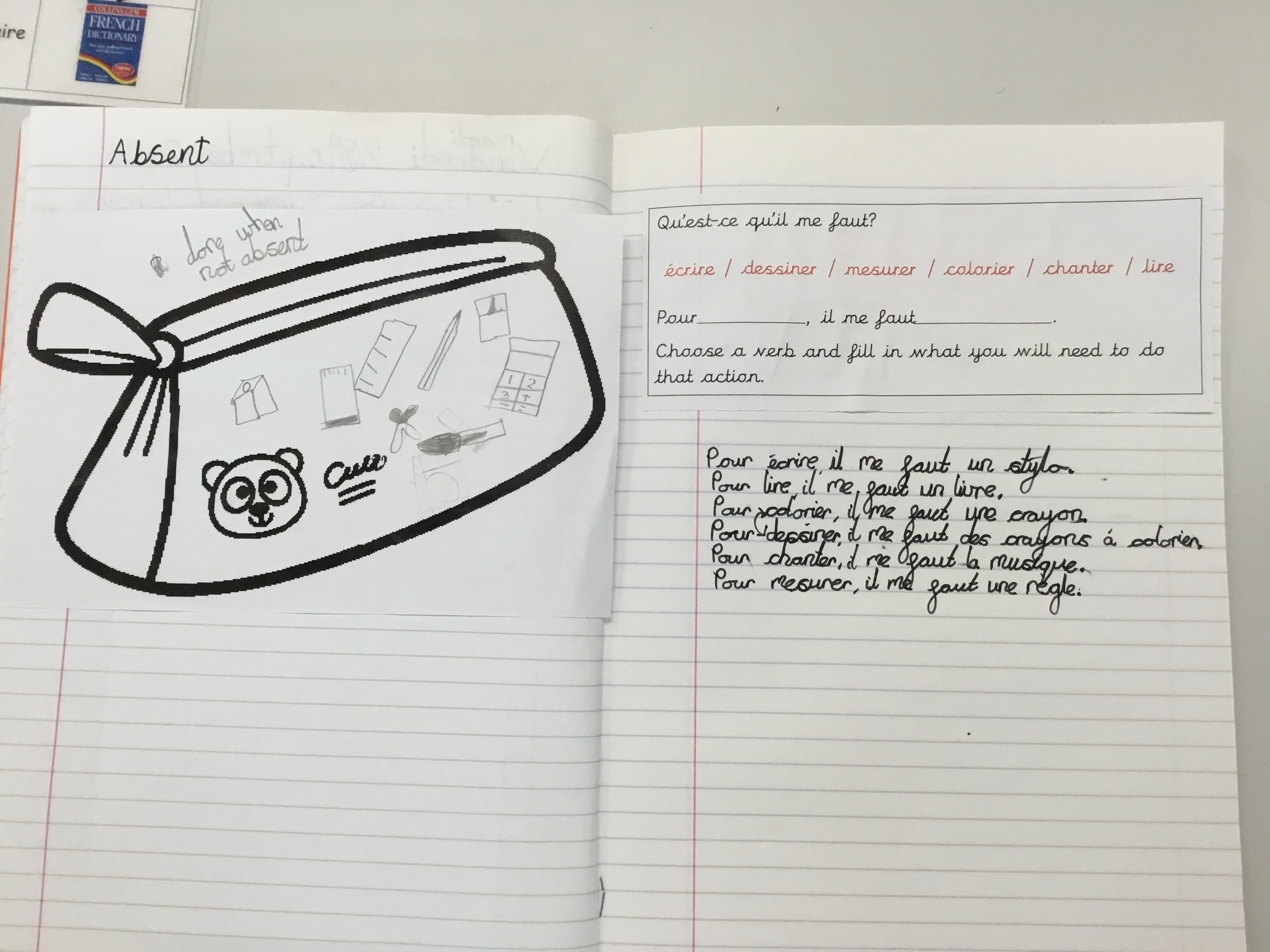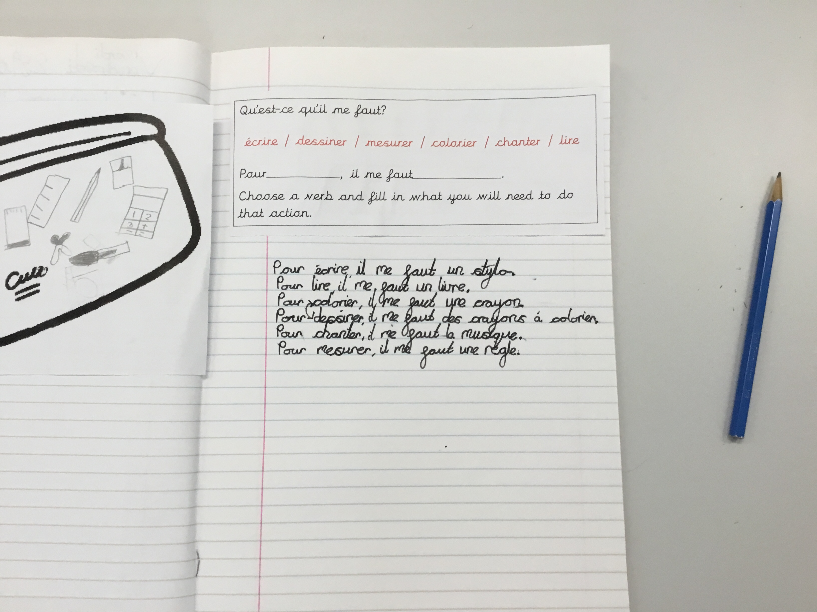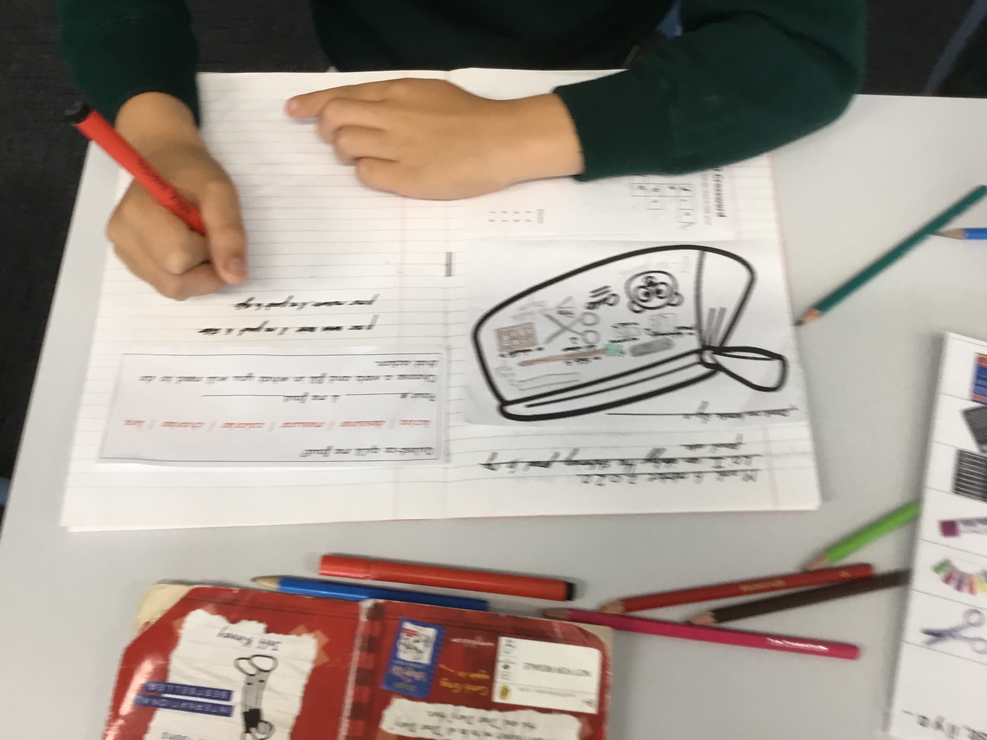 The children have been learning the vocabulary for the different items found in their pencil cases. They practised asking each other what they would need in order to write or draw.