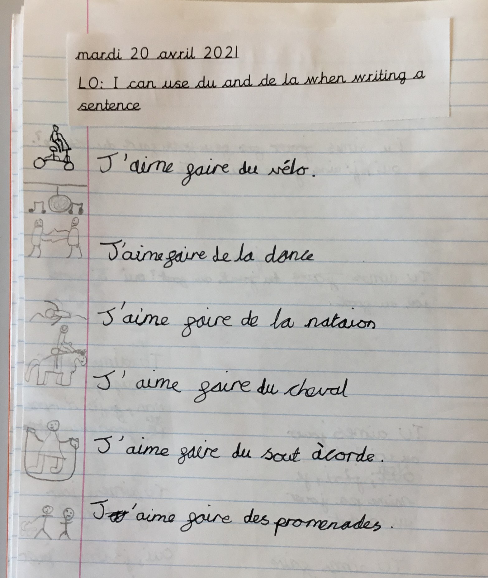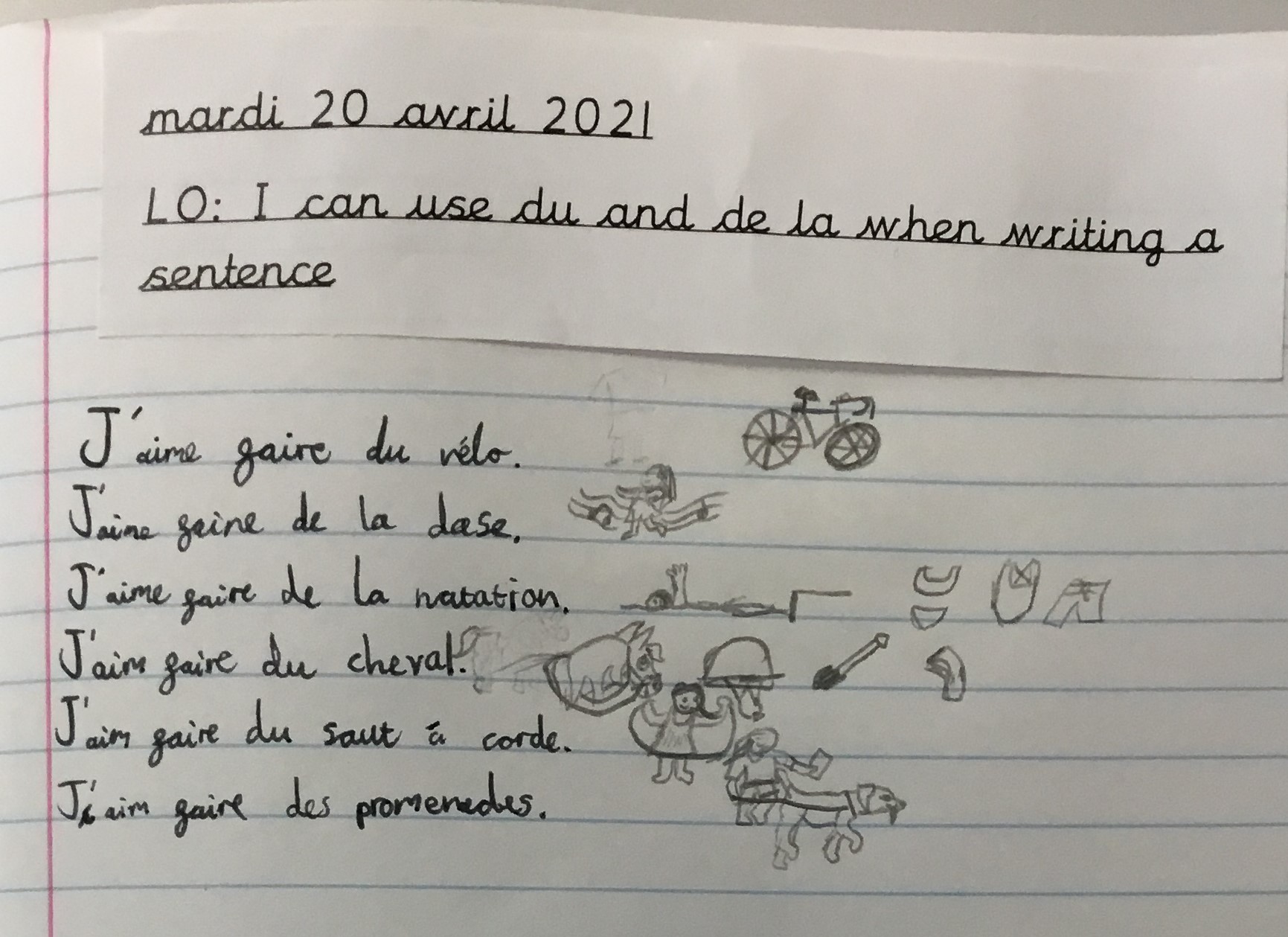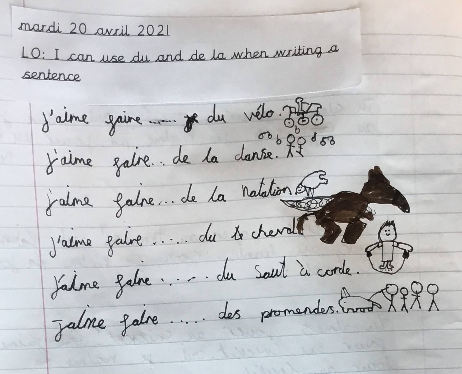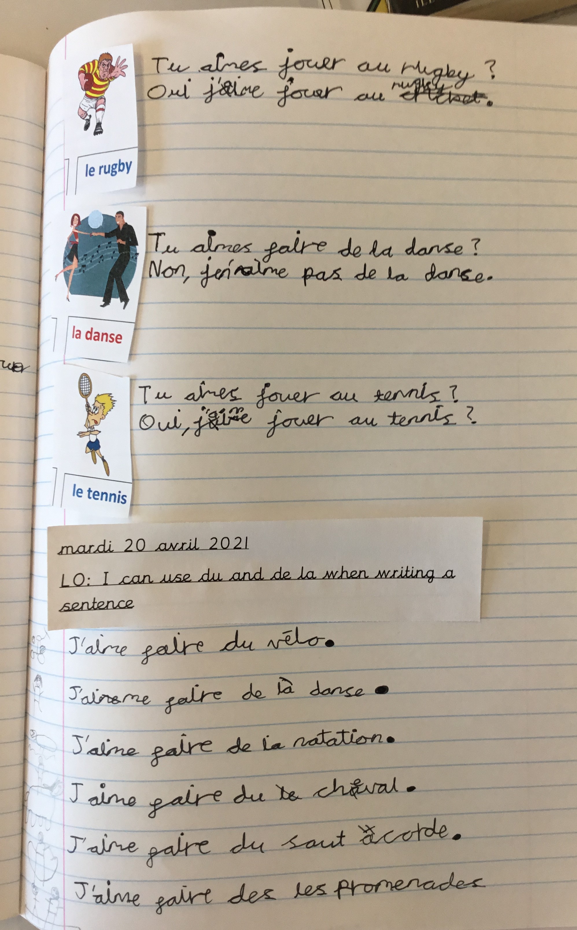 Year 4 revised sporting vocabulary,sang a song called: J’aime le sport!They then played guess the sport behind a picture of the French flag using the sentence structure, Je fais or Je joue, where appropriate. They then used a sentence scaffold to write their own sentences.