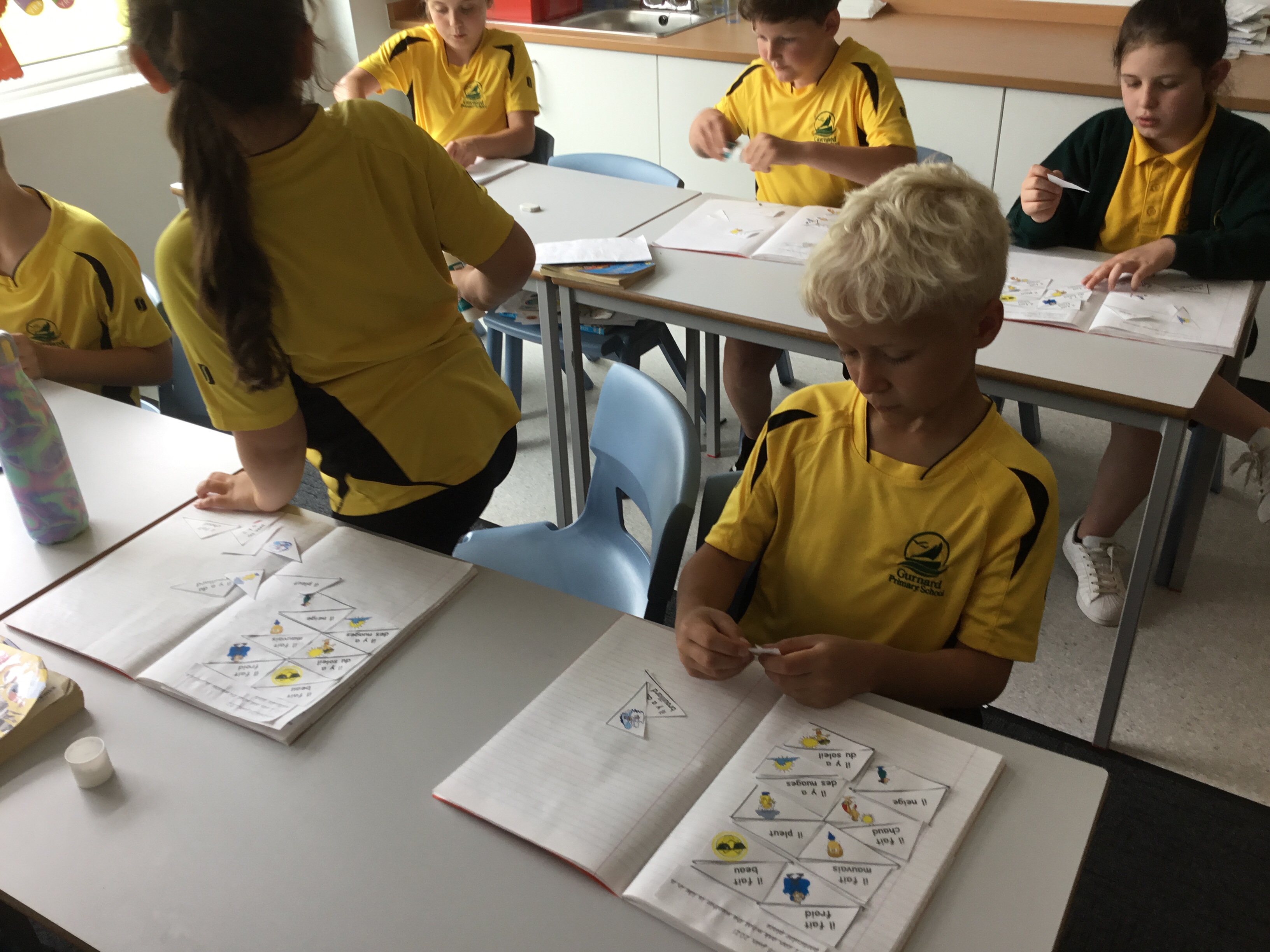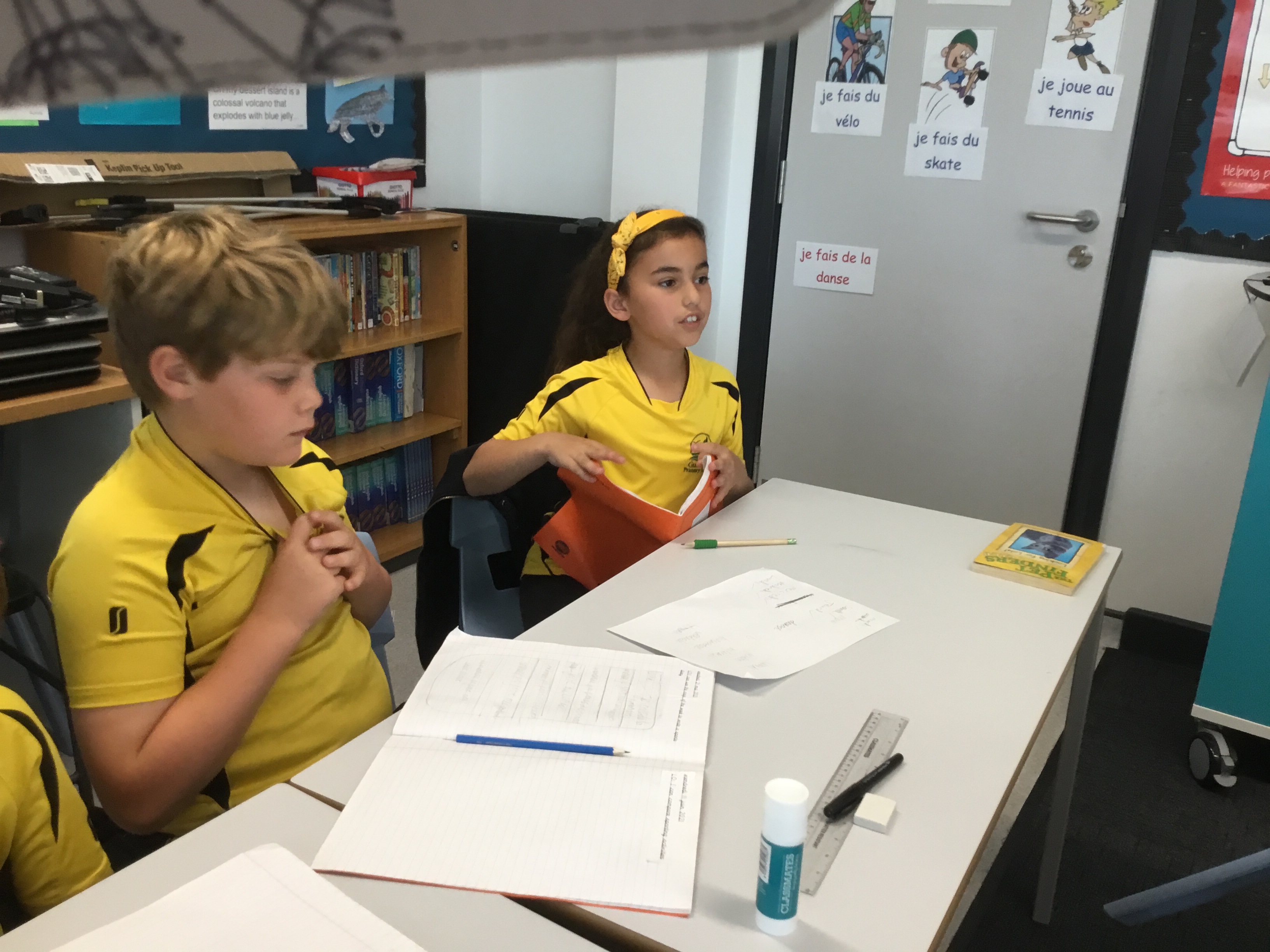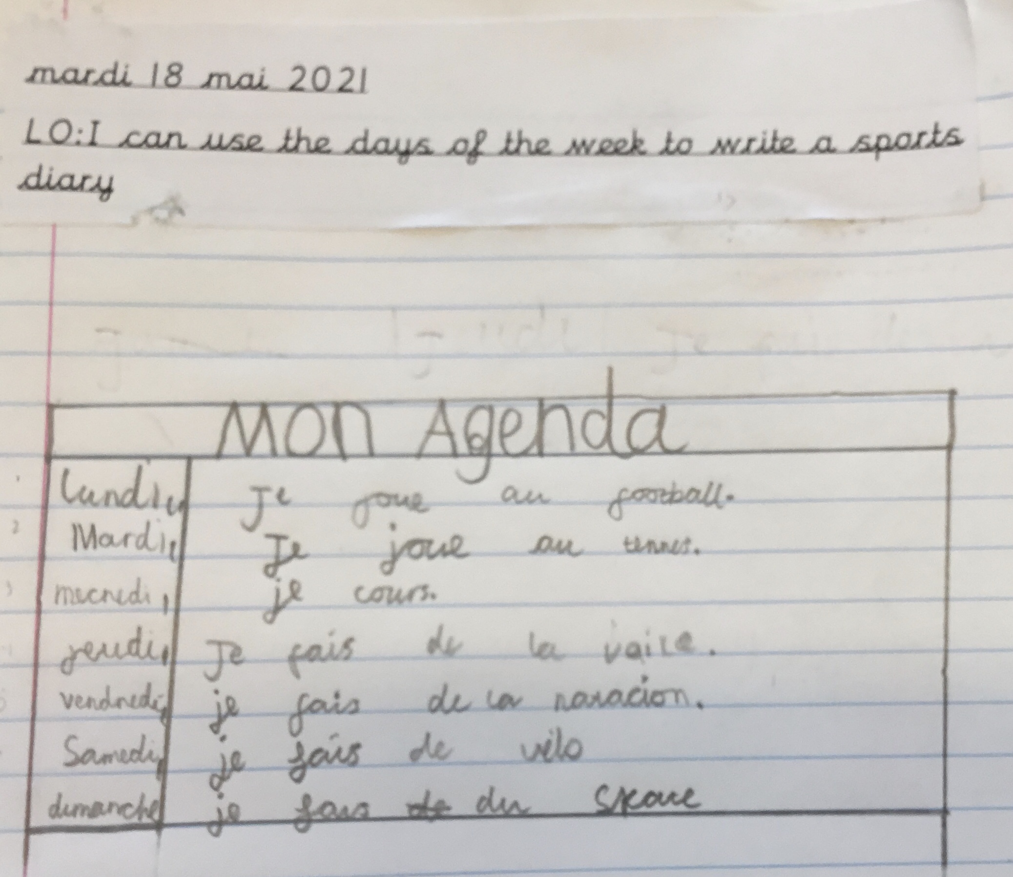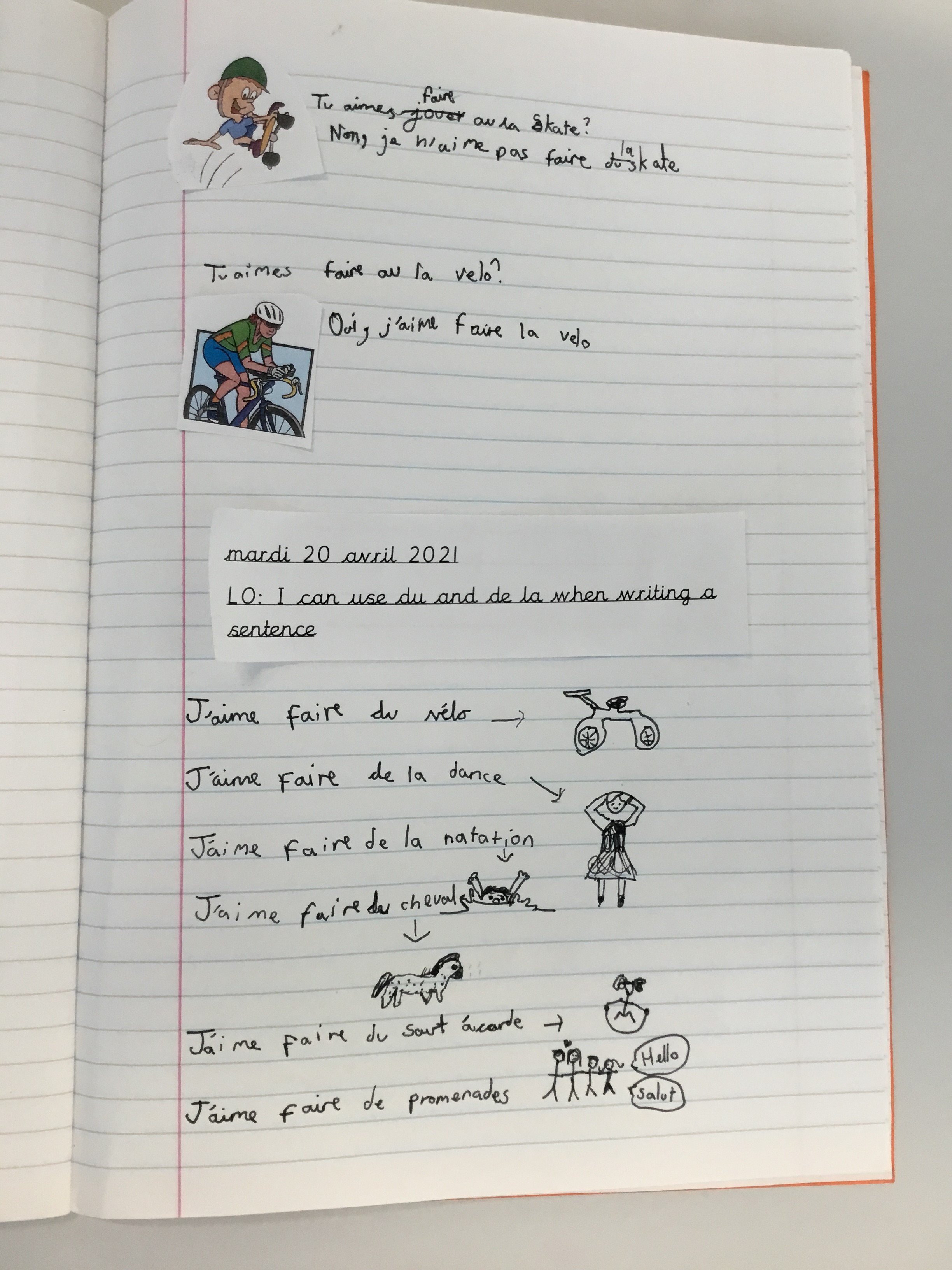 Year 4 revised sporting vocabulary,sang a song called: J’aime le sport!They then played guess the sport behind a picture of the French flag using the sentence structure, Je fais or Je joue, where appropriate. They then used a sentence scaffold to write their own sentences.