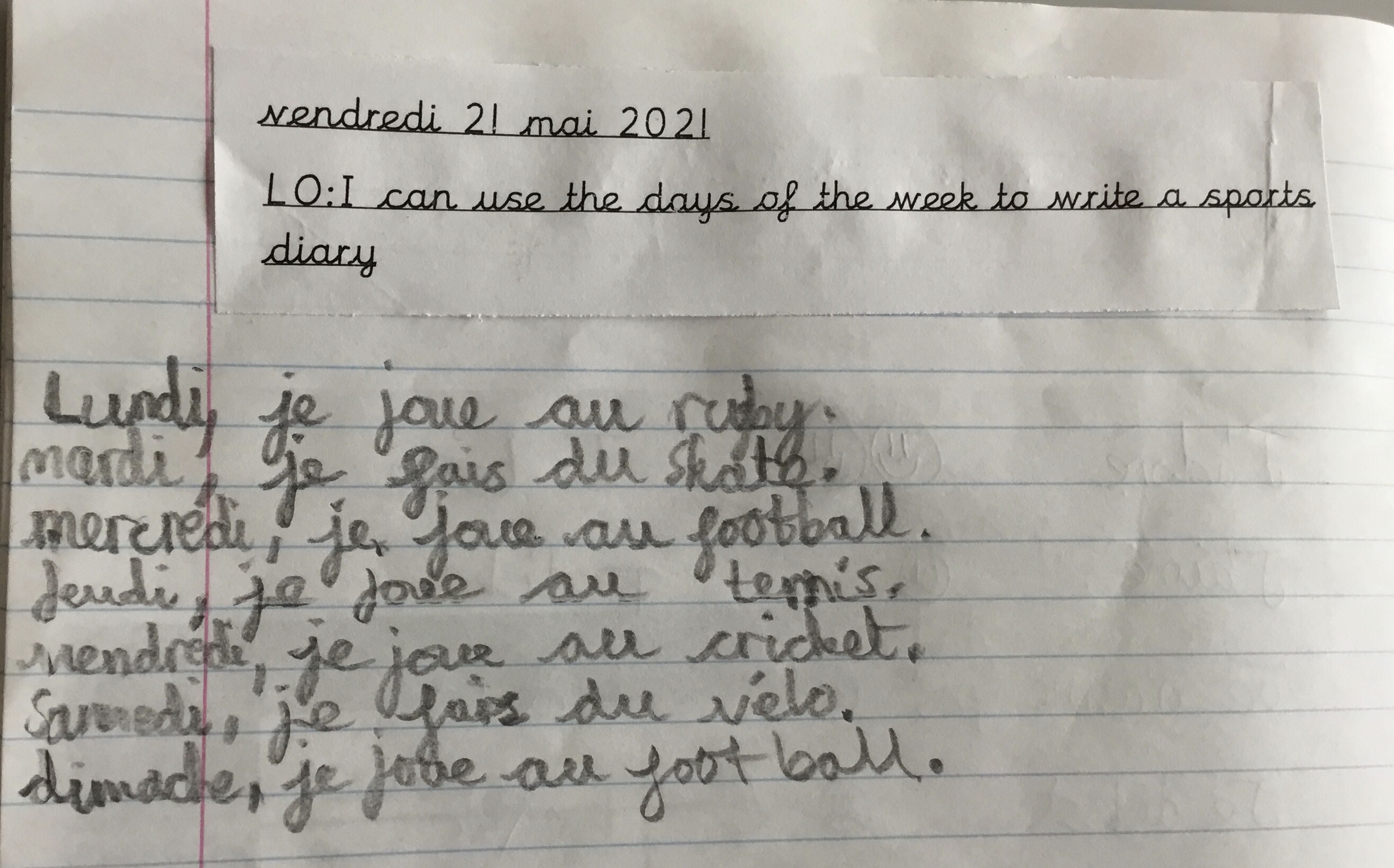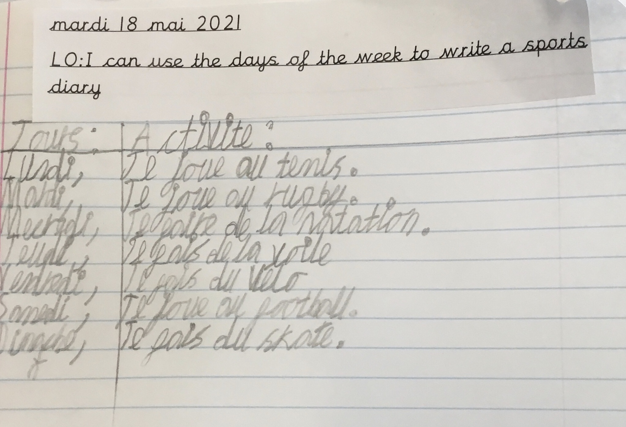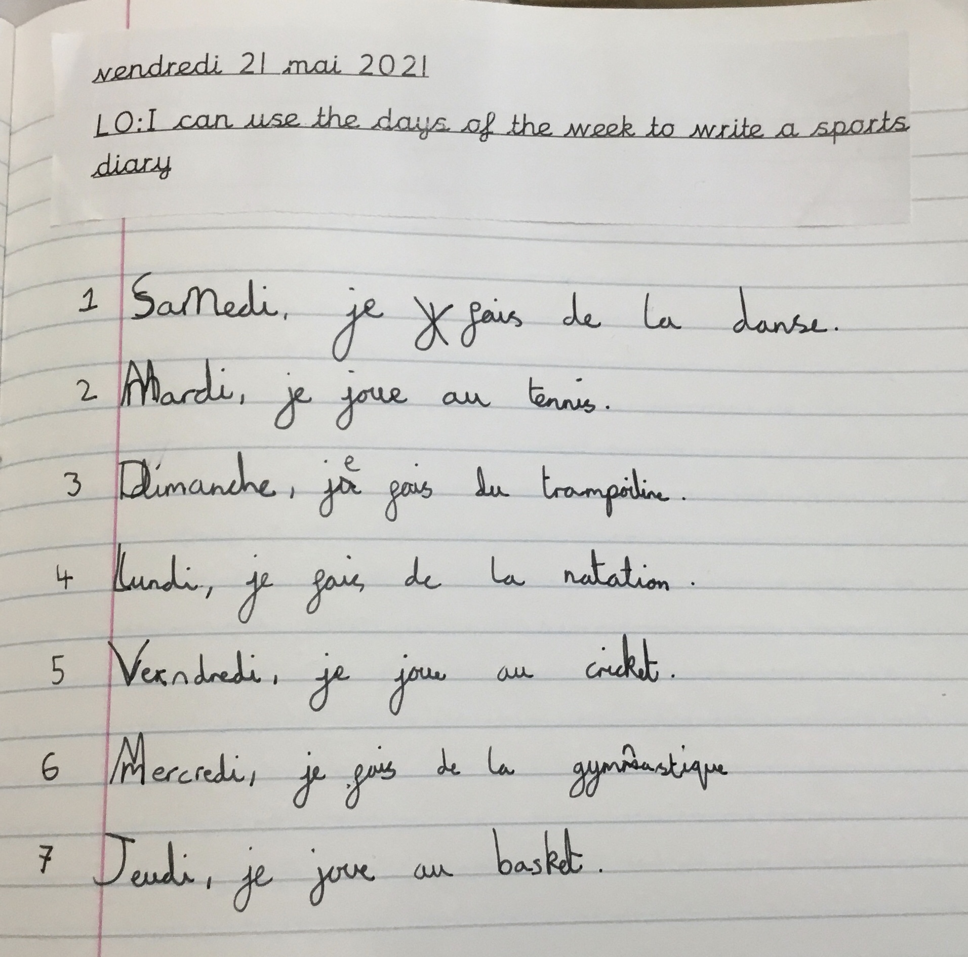 Year 4 revised the different sports vocabulary and sentence structures. They then revised the days of the week, through song and an online crossword. They then used a template and help mat to write their own sports diary. A very busy week for most children!