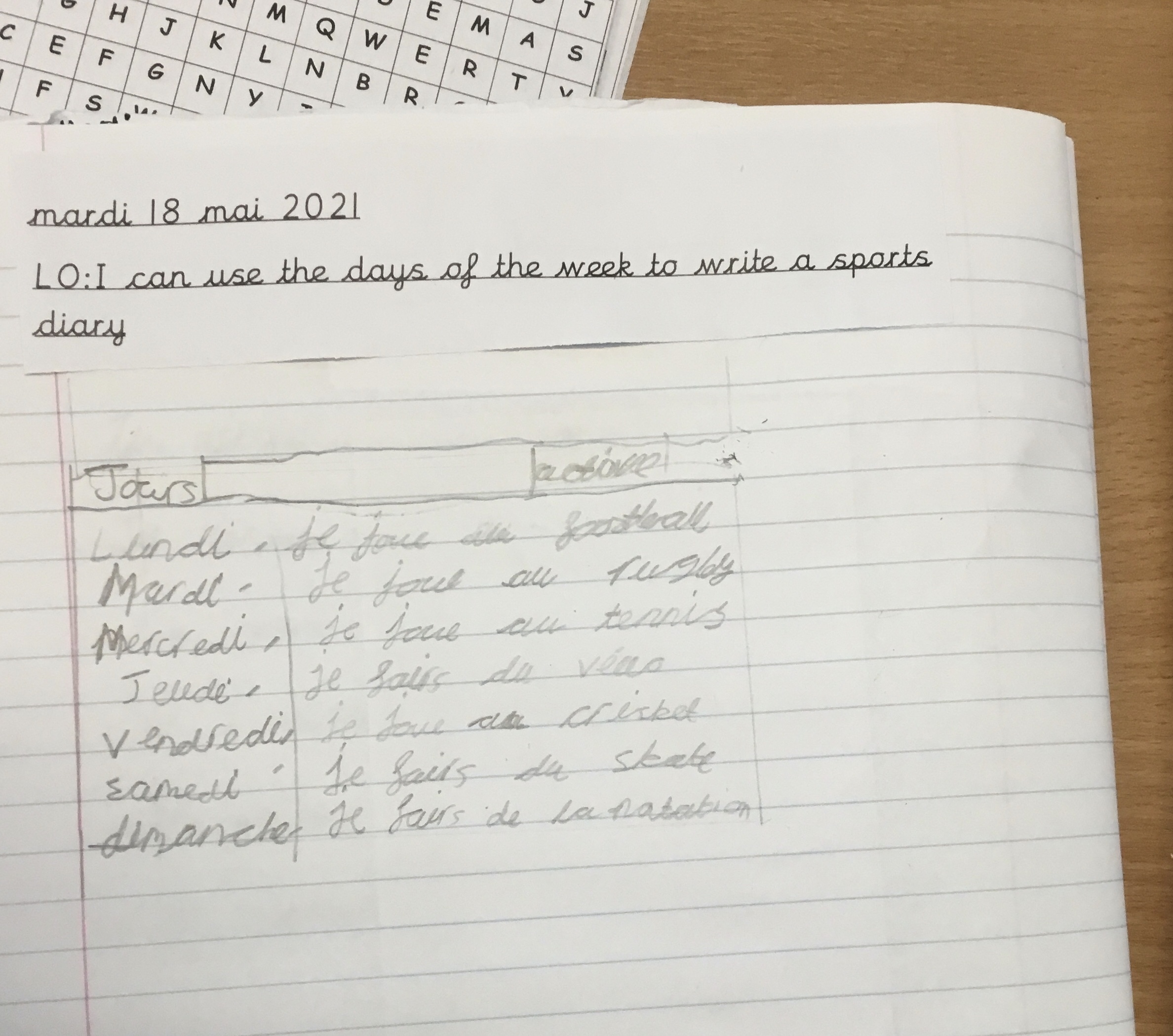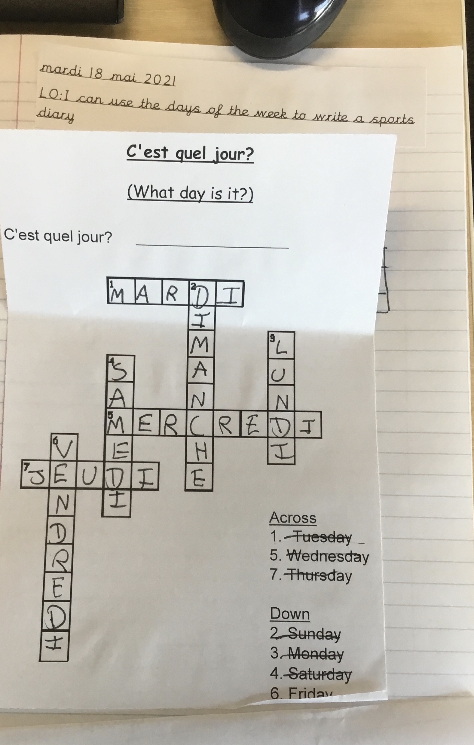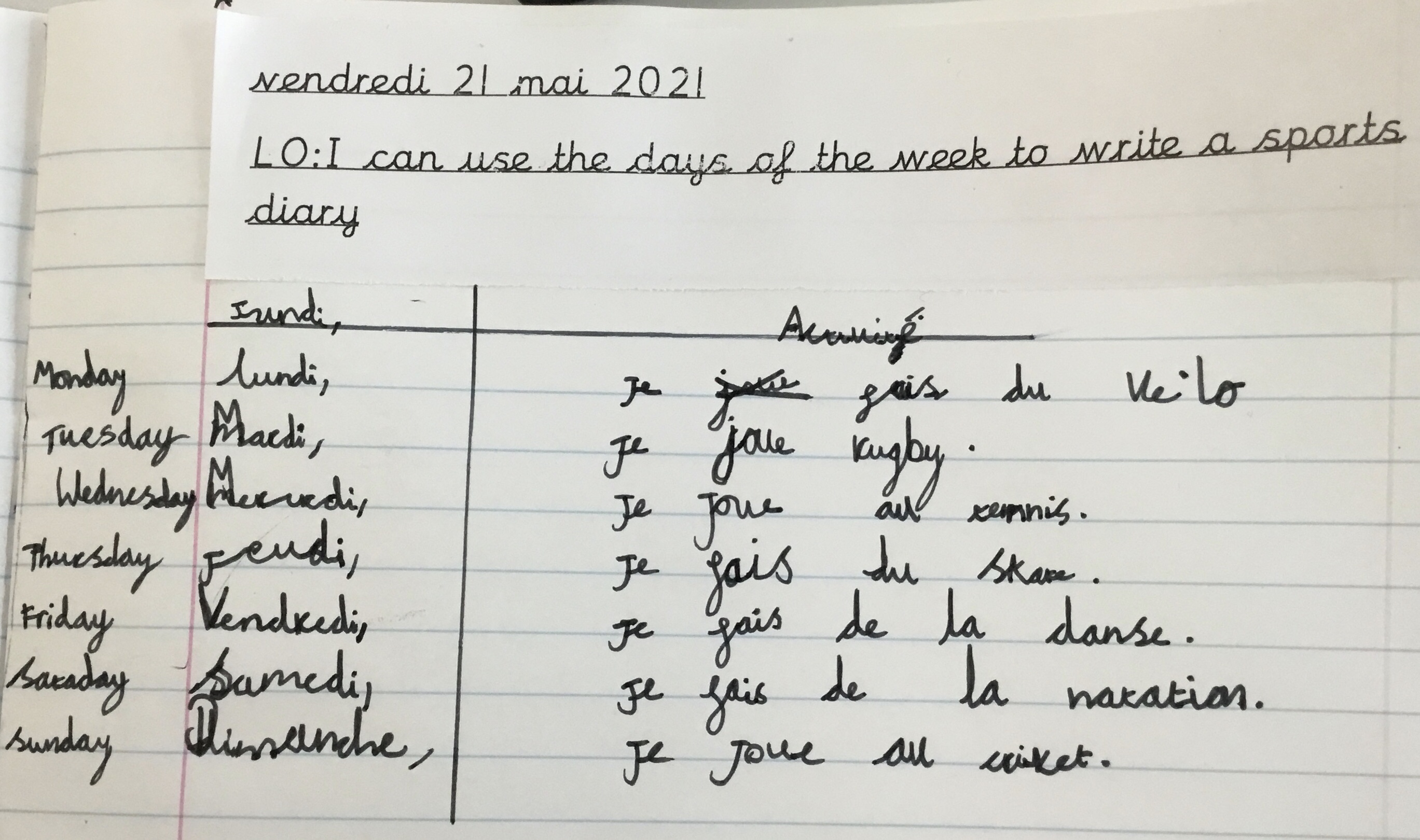 Year 4 revised the different sports vocabulary and sentence structures. They then revised the days of the week, through song and an online crossword. They then used a template and help mat to write their own sports diary. A very busy week for most children!