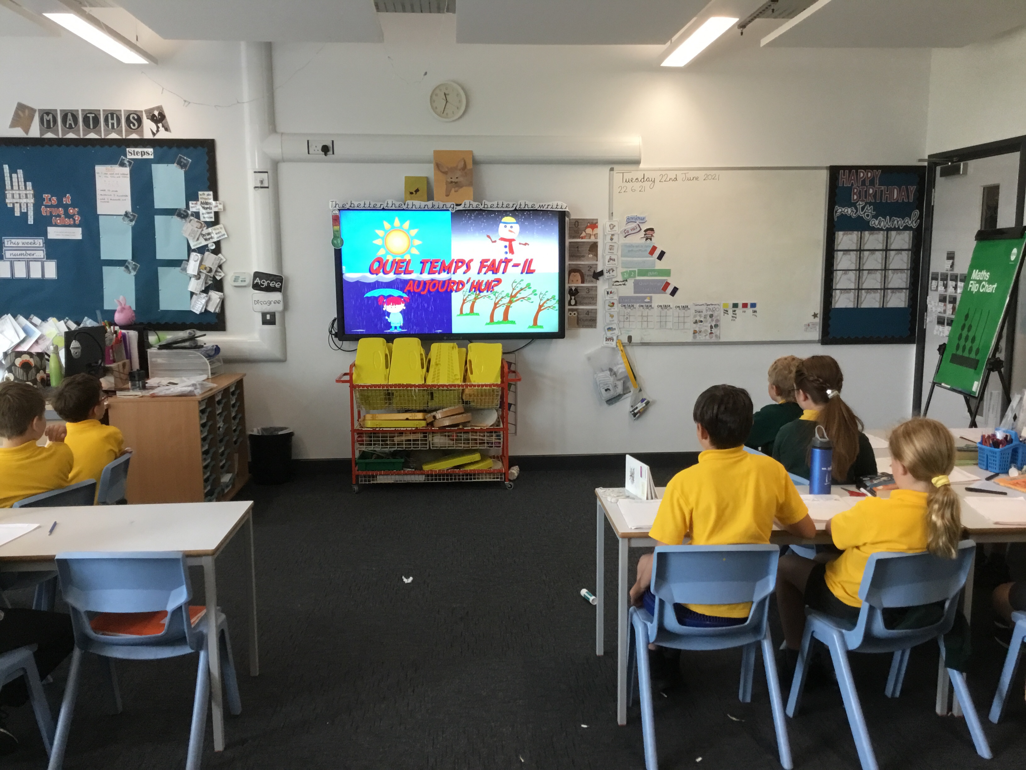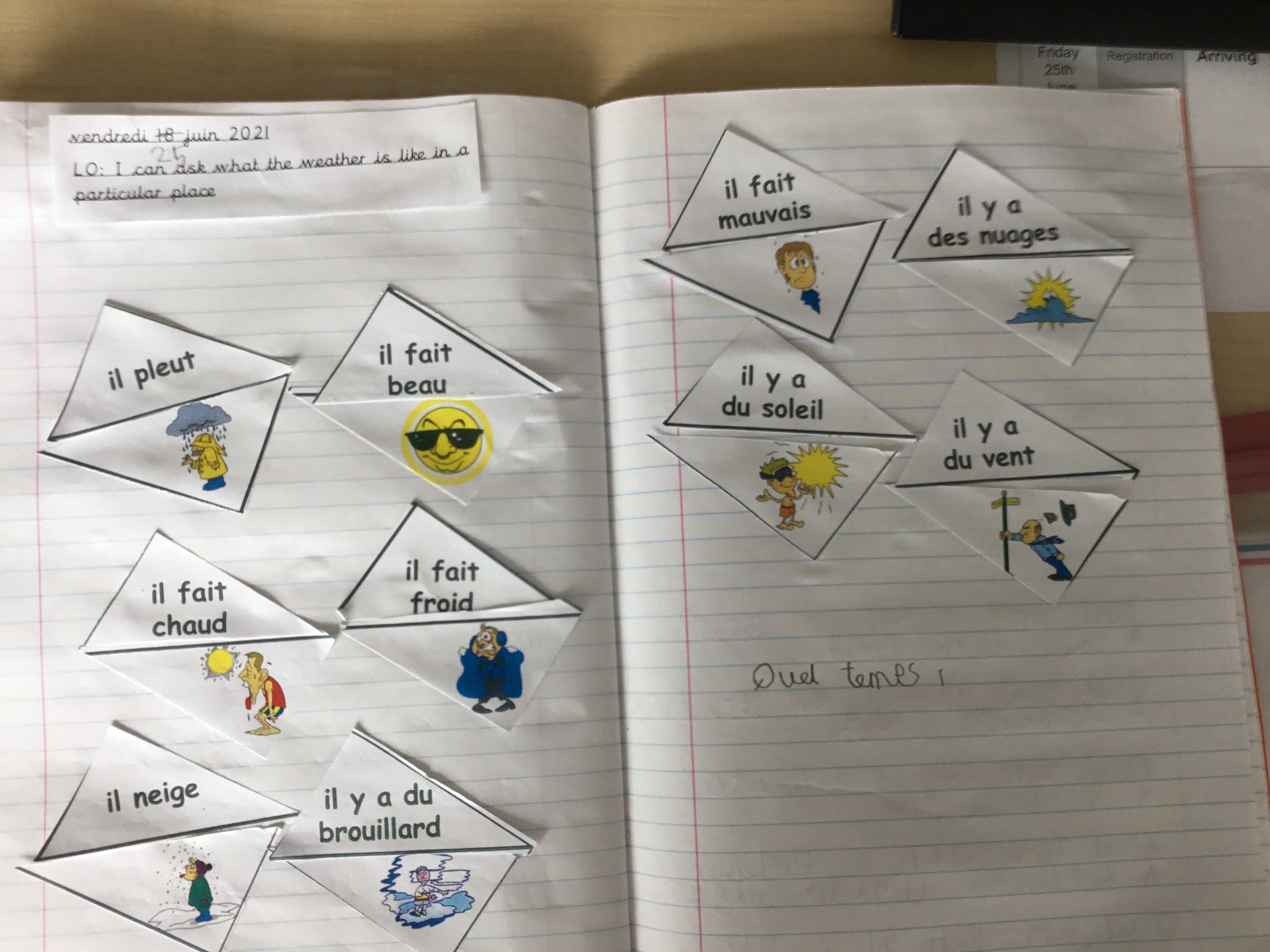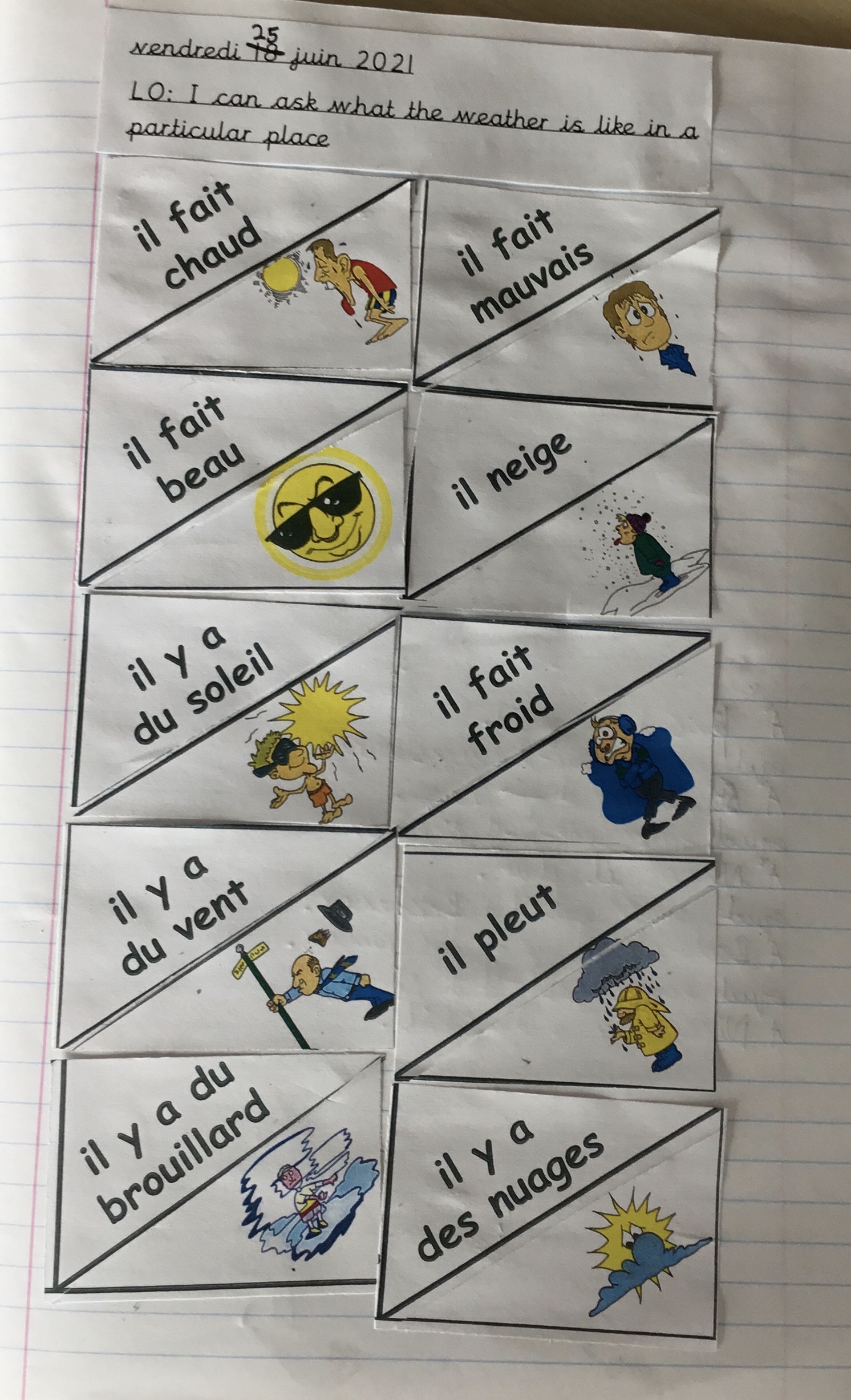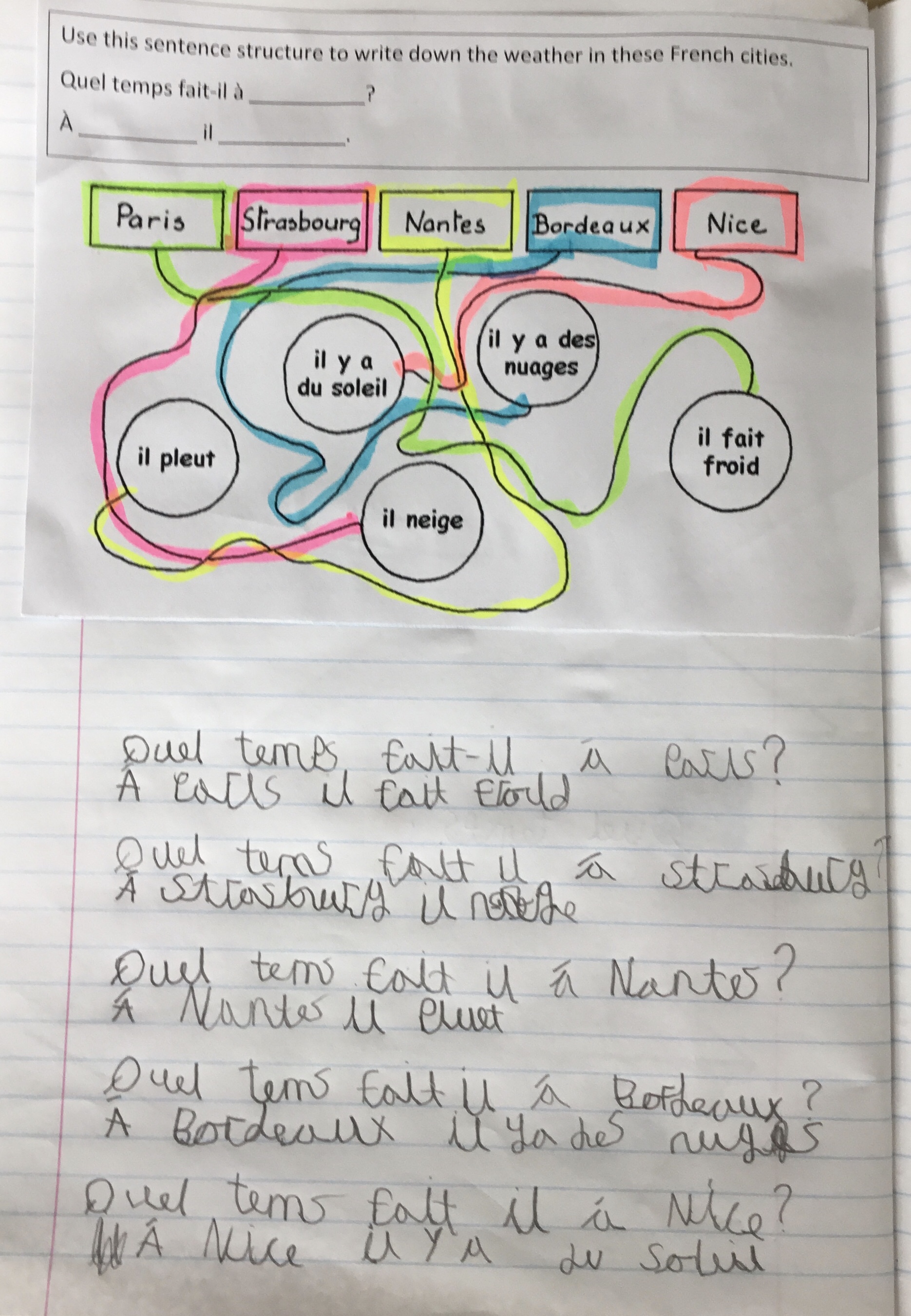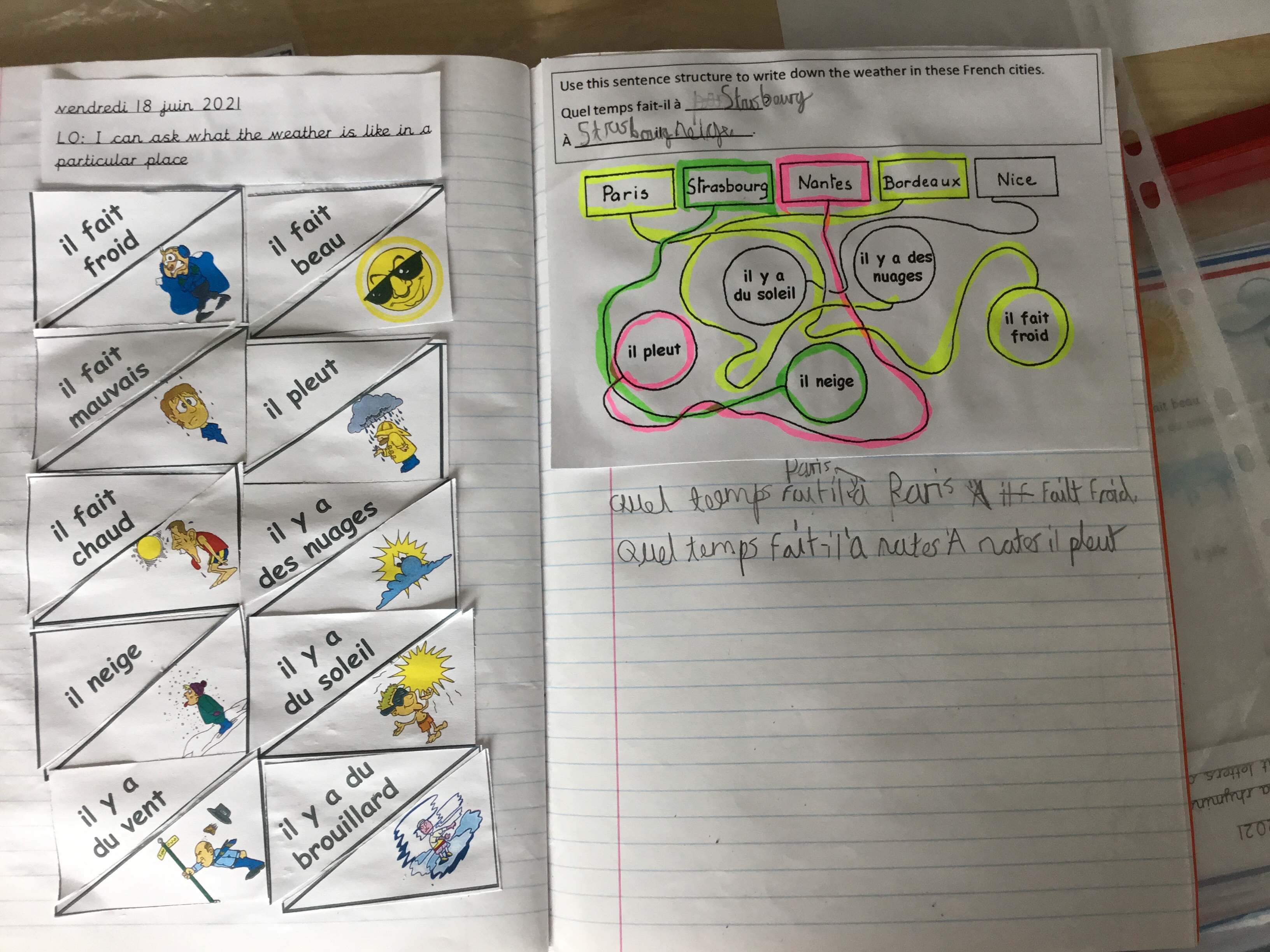 Year 4 learnt the vocabulary associated with answering the question: what is the weather today? They practised the sentences whilst miming actions. They then matched pictures to the sentences. They also wrote some sentences using a given sentence structure about what the weather was like in different cities in France.