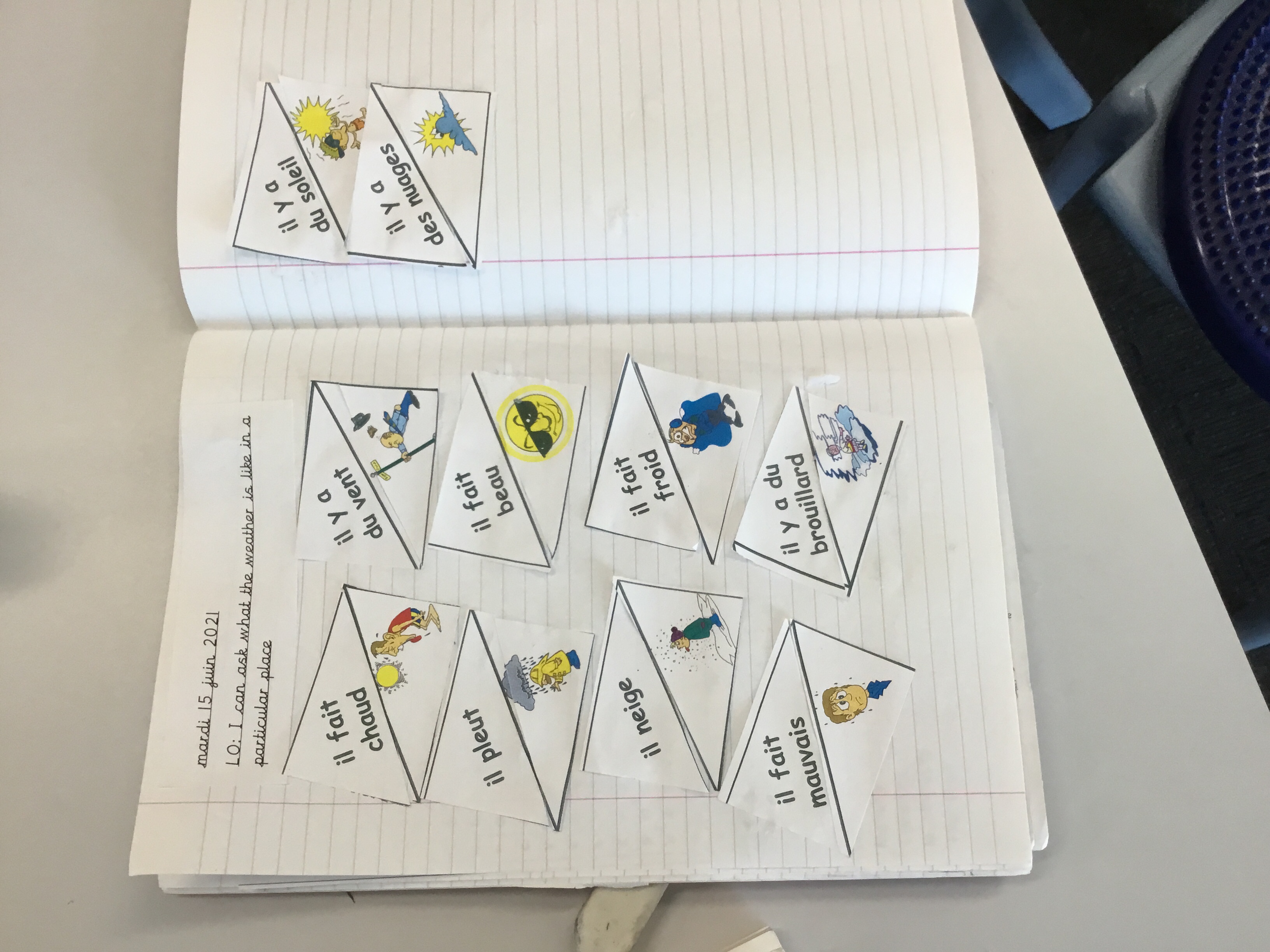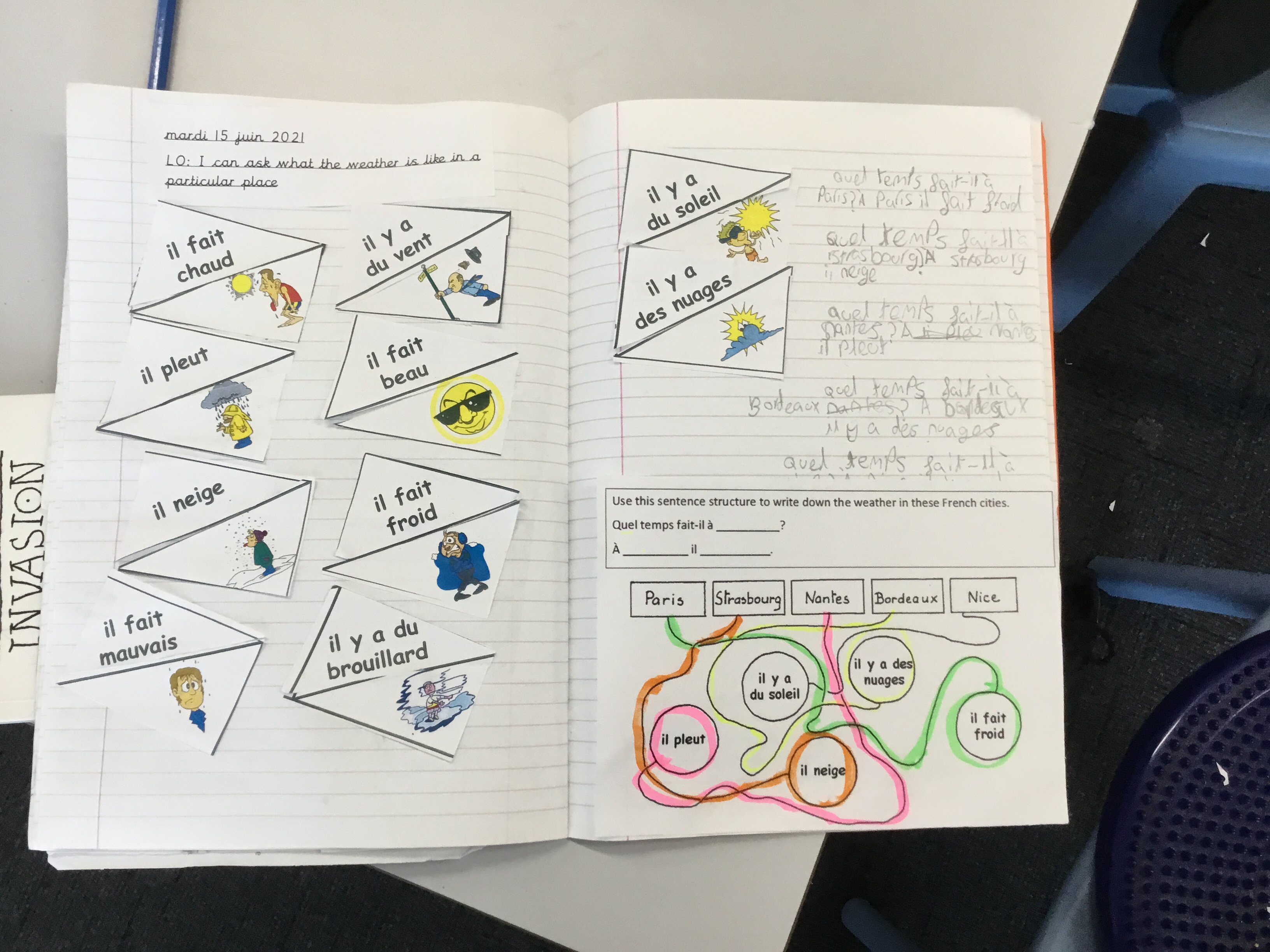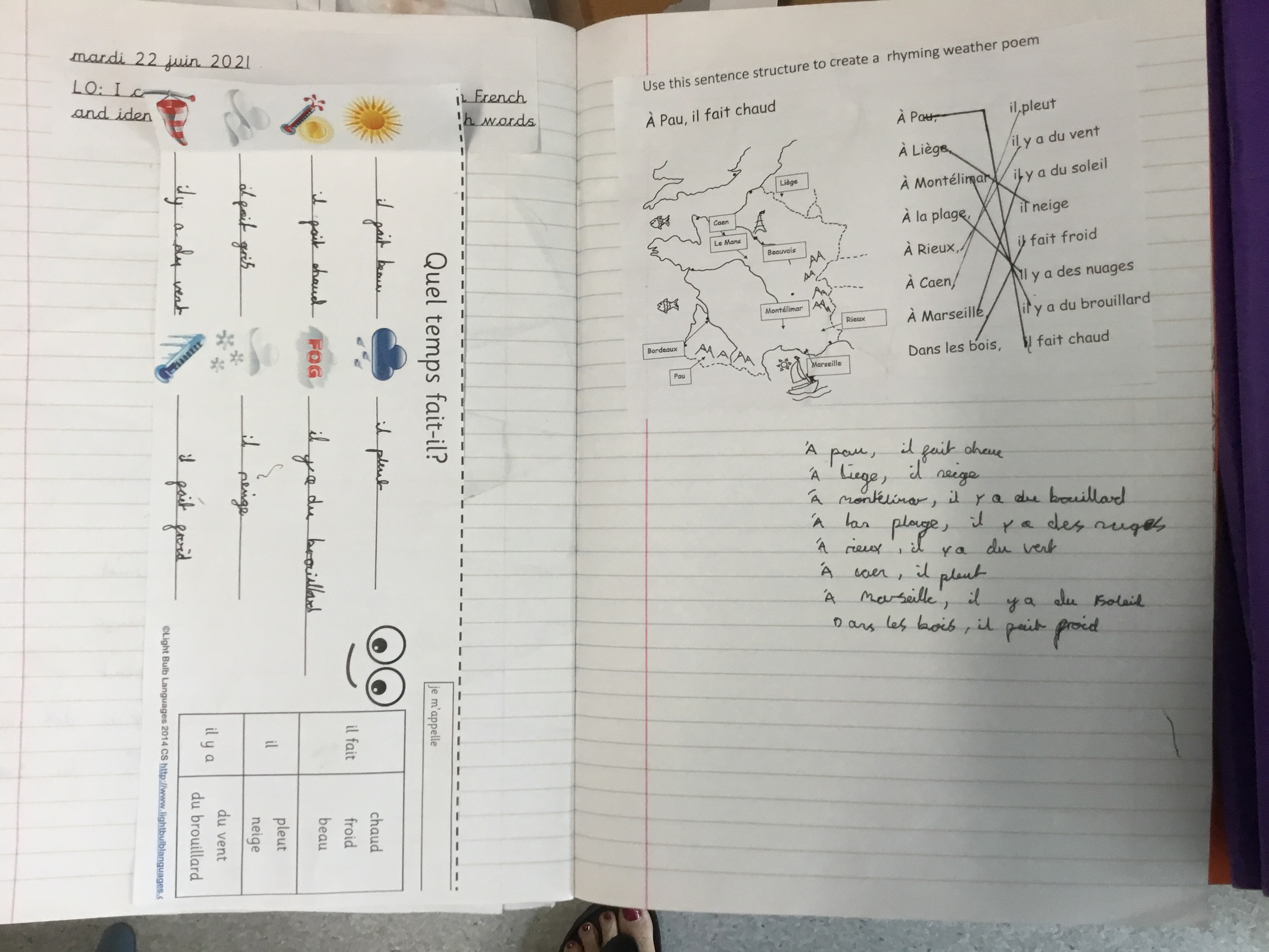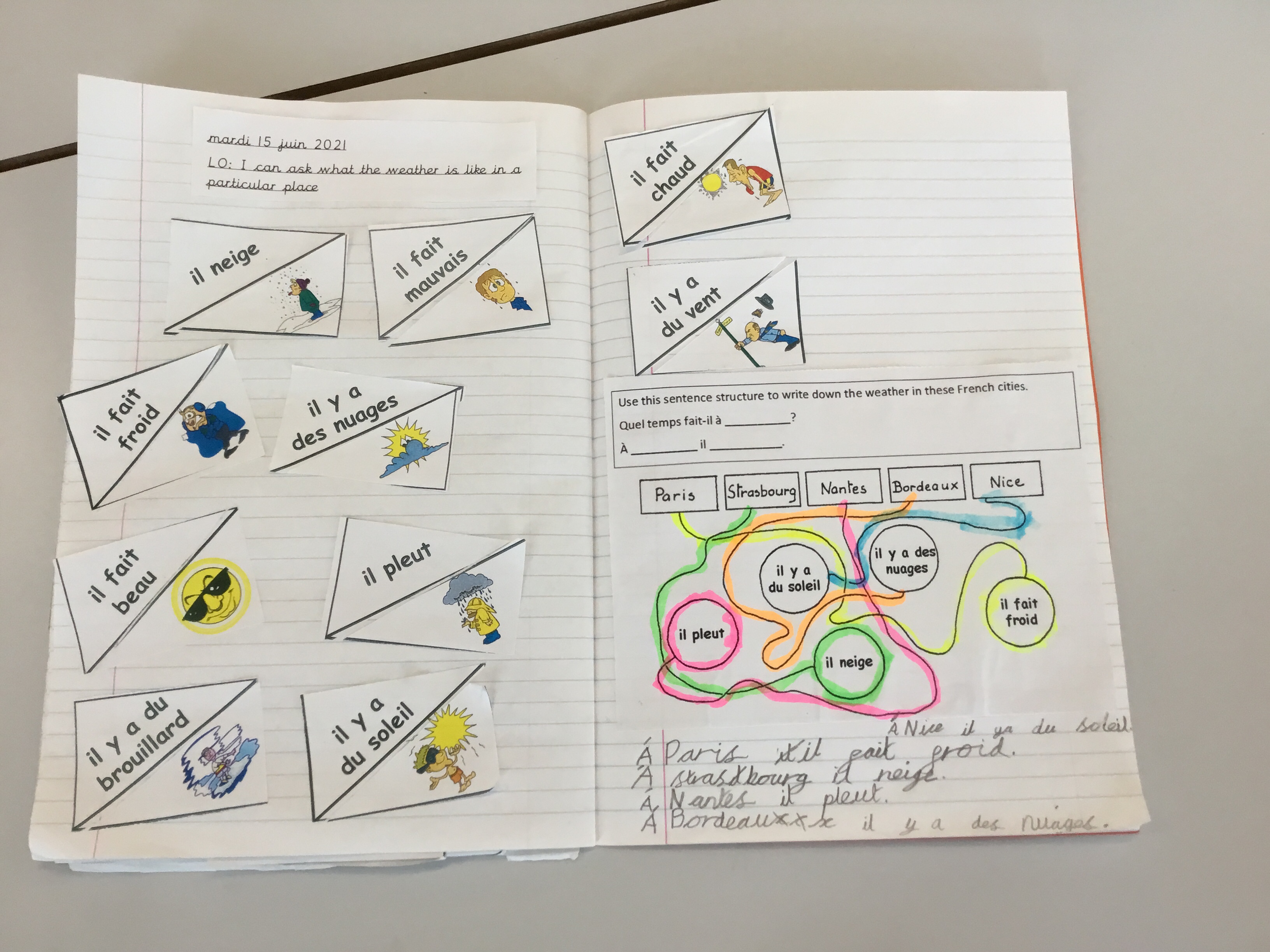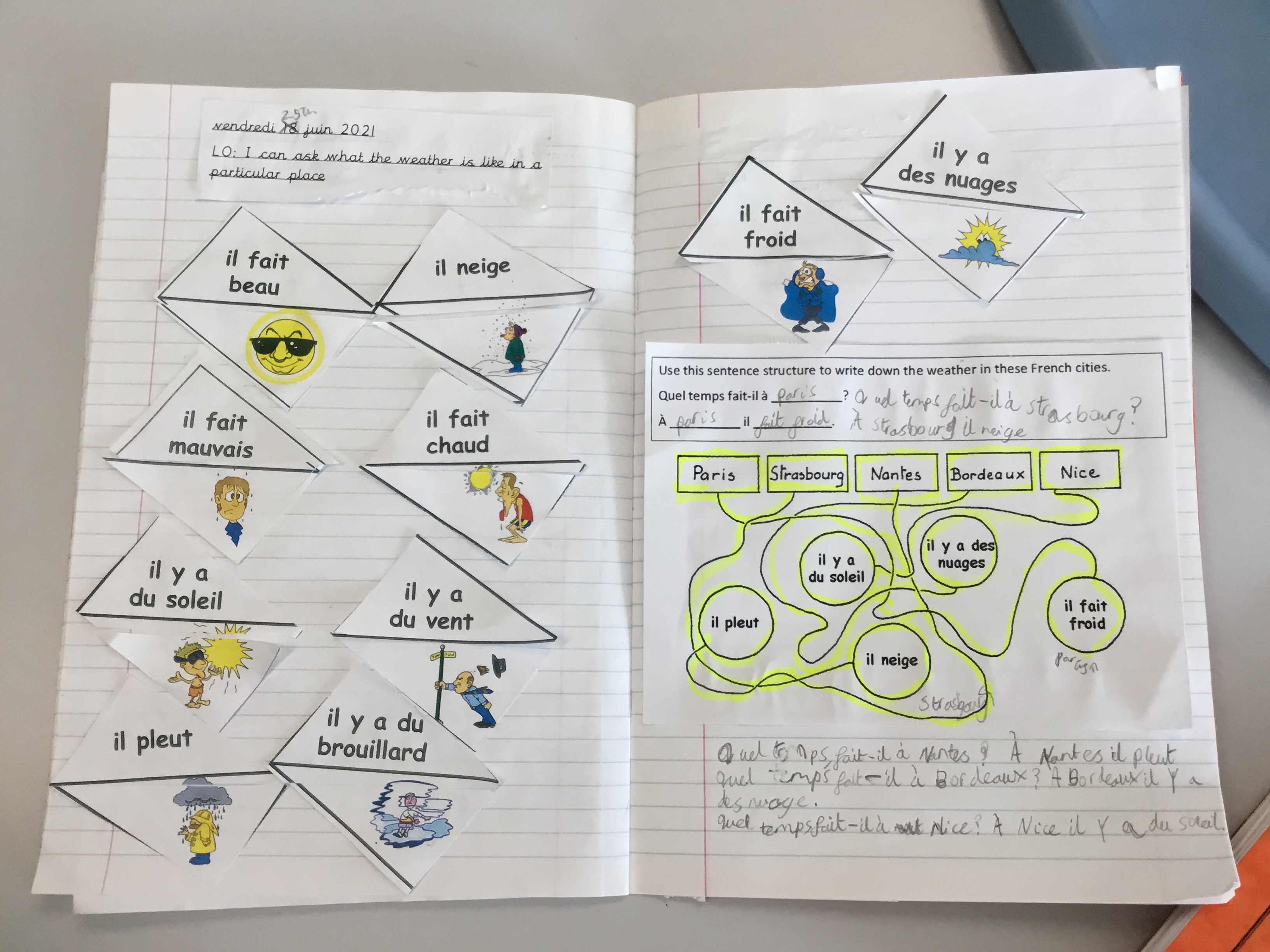 Year 4 learnt the vocabulary associated with answering the question: what is the weather today? They practised the sentences whilst miming actions. They then matched pictures to the sentences. They also wrote some sentences using a given sentence structure about what the weather was like in different cities in France.