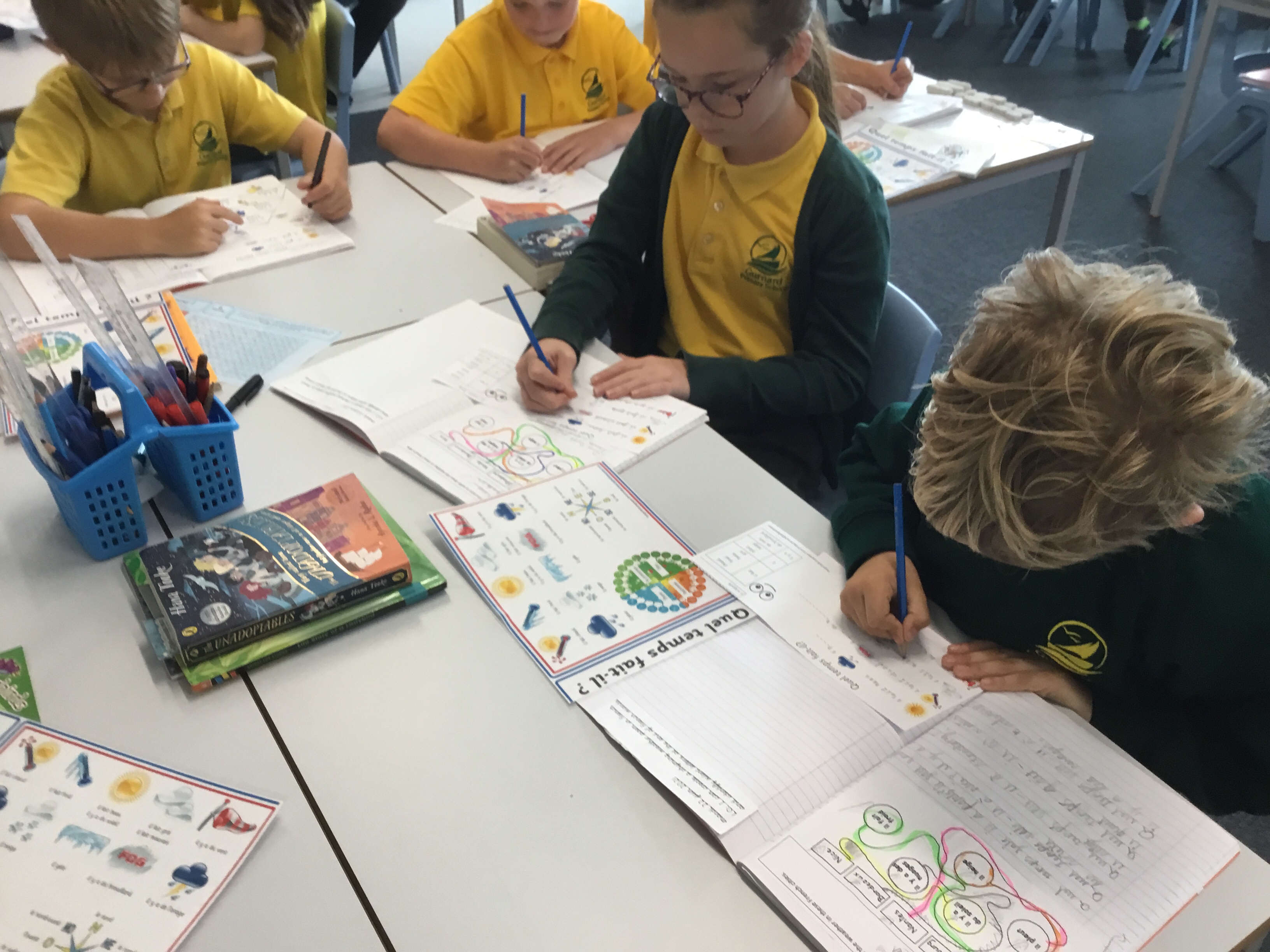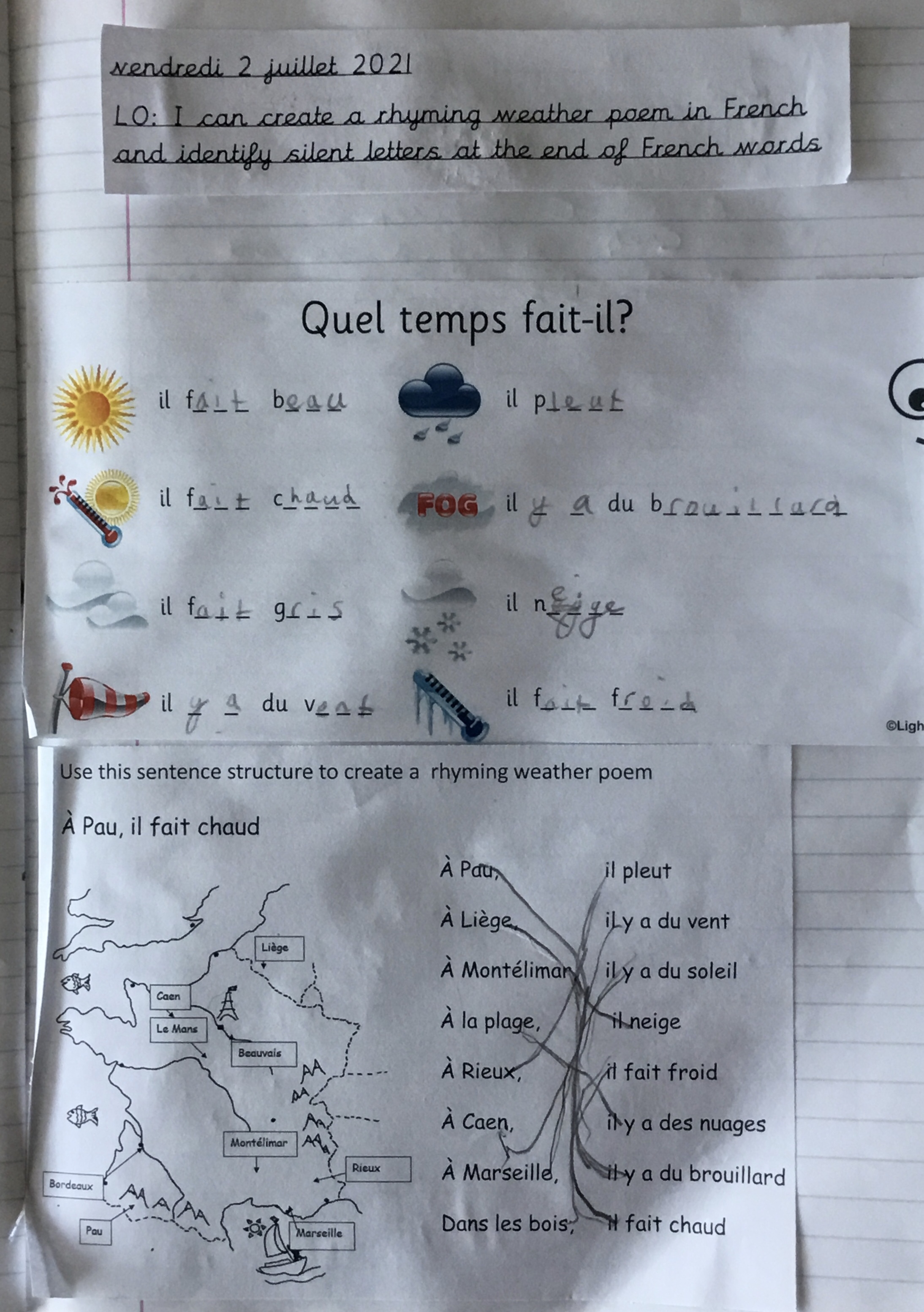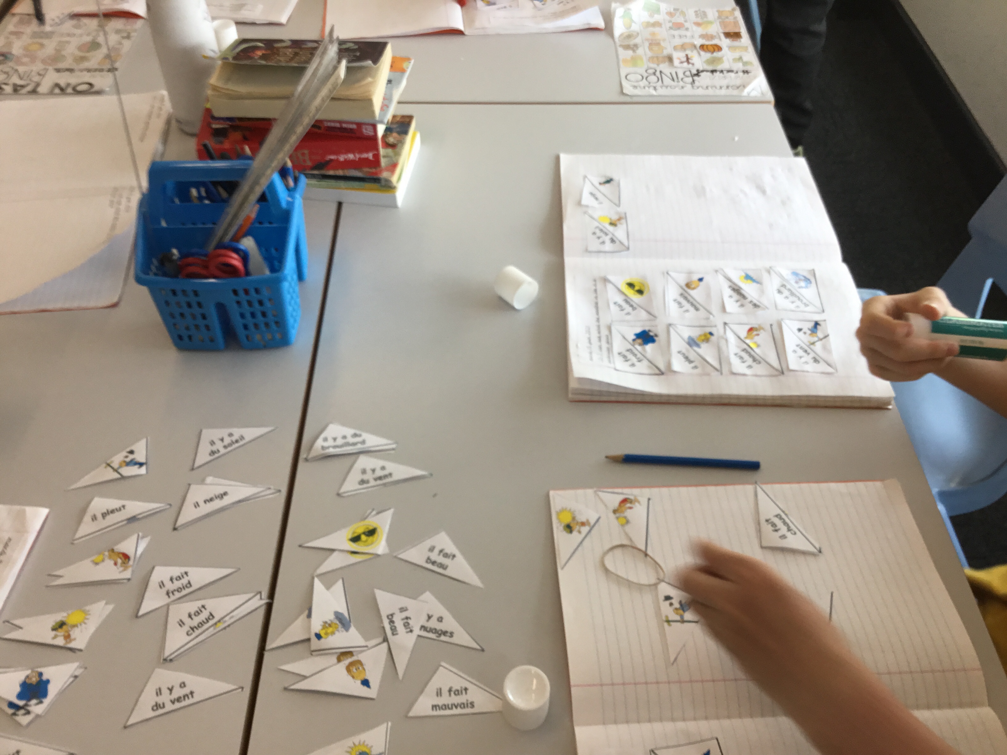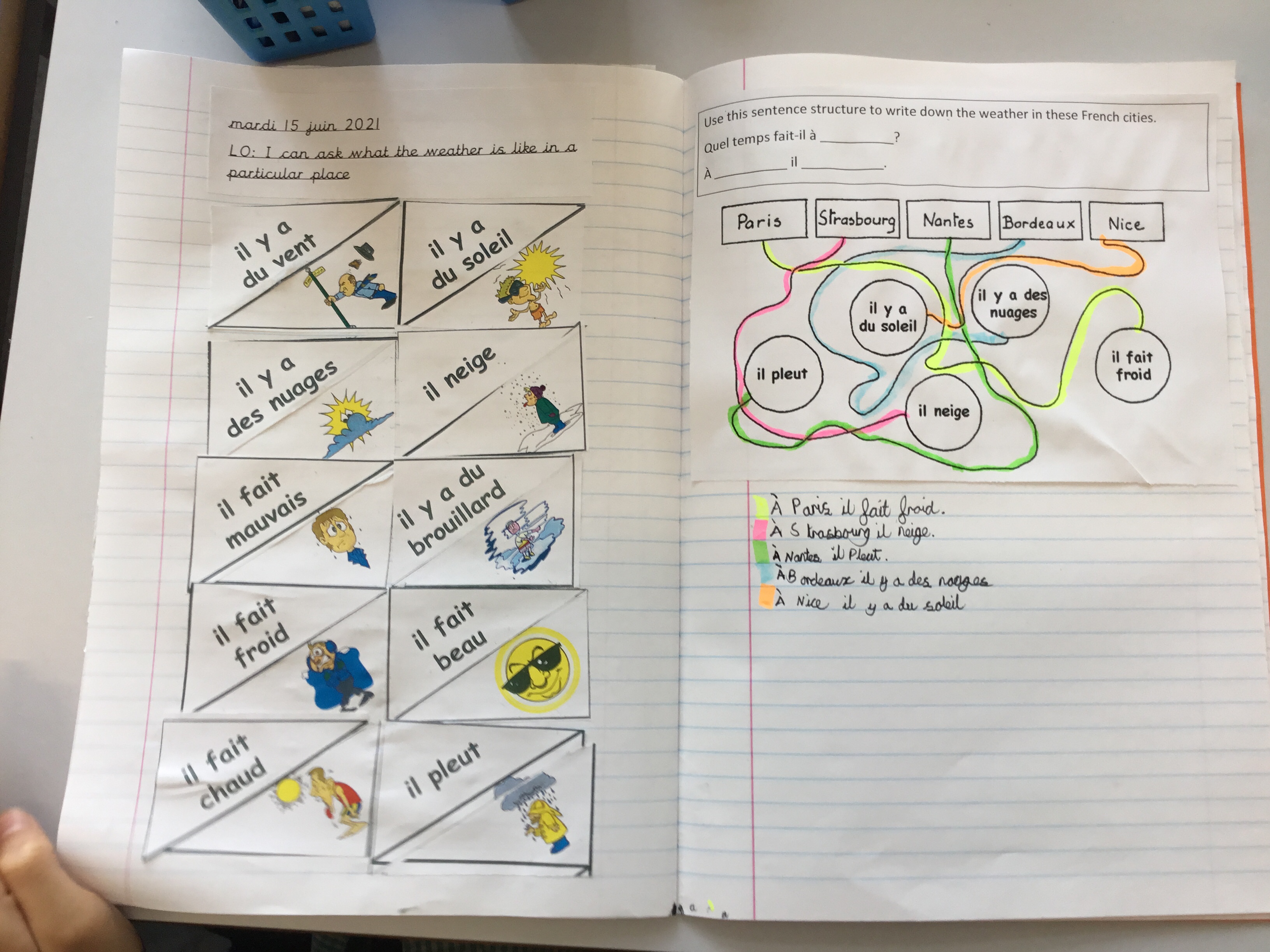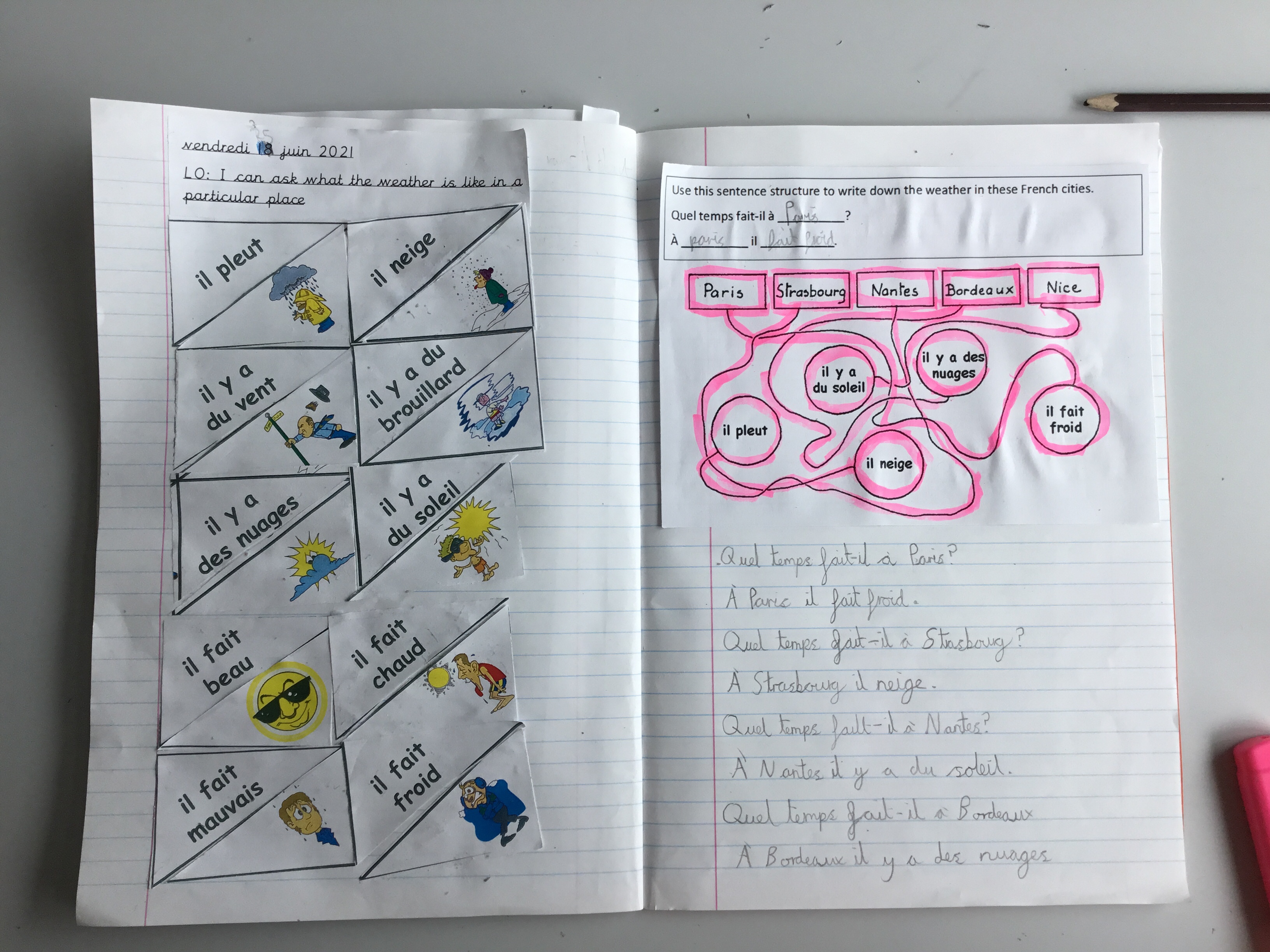 Year 4 learnt the vocabulary associated with answering the question: what is the weather today? They practised the sentences whilst miming actions. They then matched pictures to the sentences. They also wrote some sentences using a given sentence structure about what the weather was like in different cities in France.