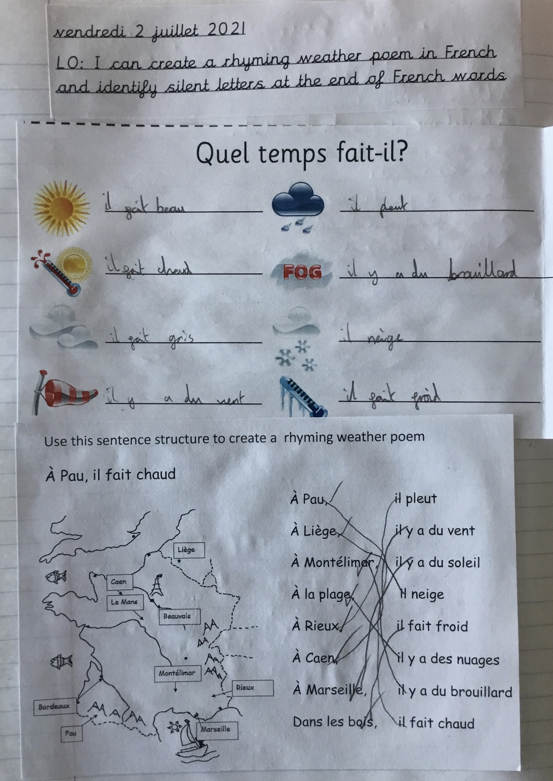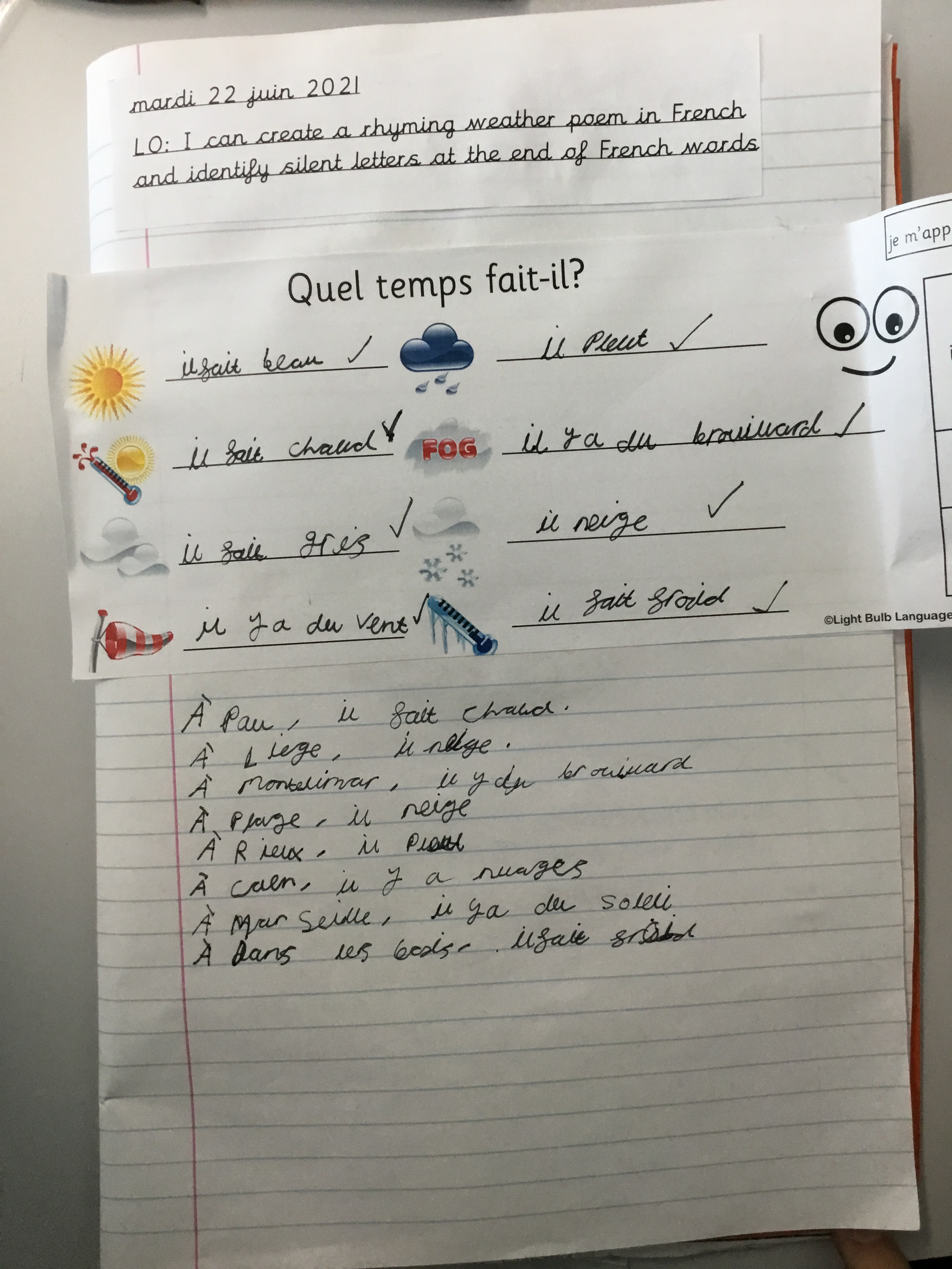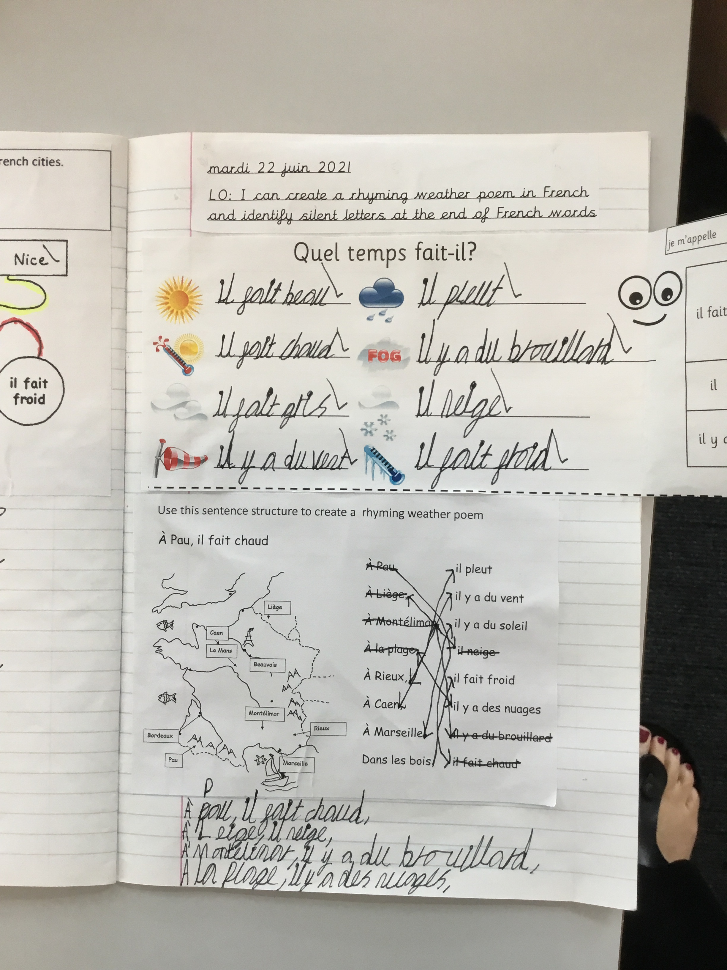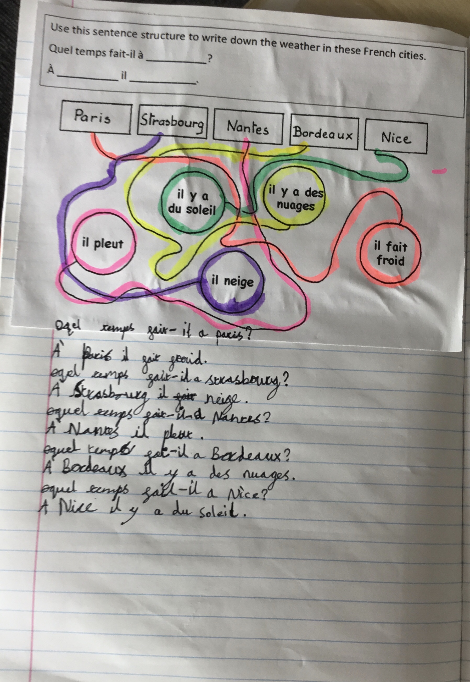 Year 4 learnt the vocabulary associated with answering the question: what is the weather today? They practised the sentences whilst miming actions. They then matched pictures to the sentences. They also wrote some sentences using a given sentence structure about what the weather was like in different cities in France.