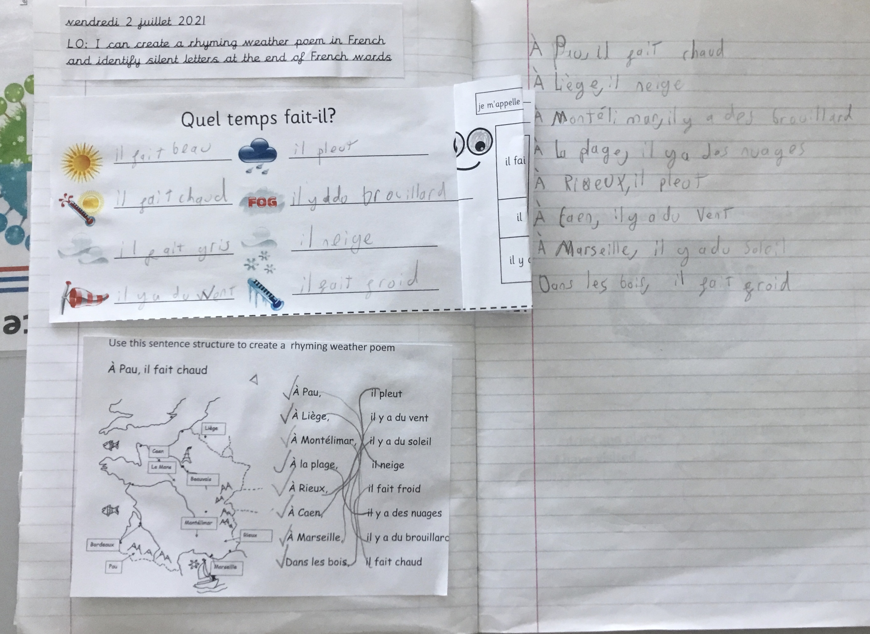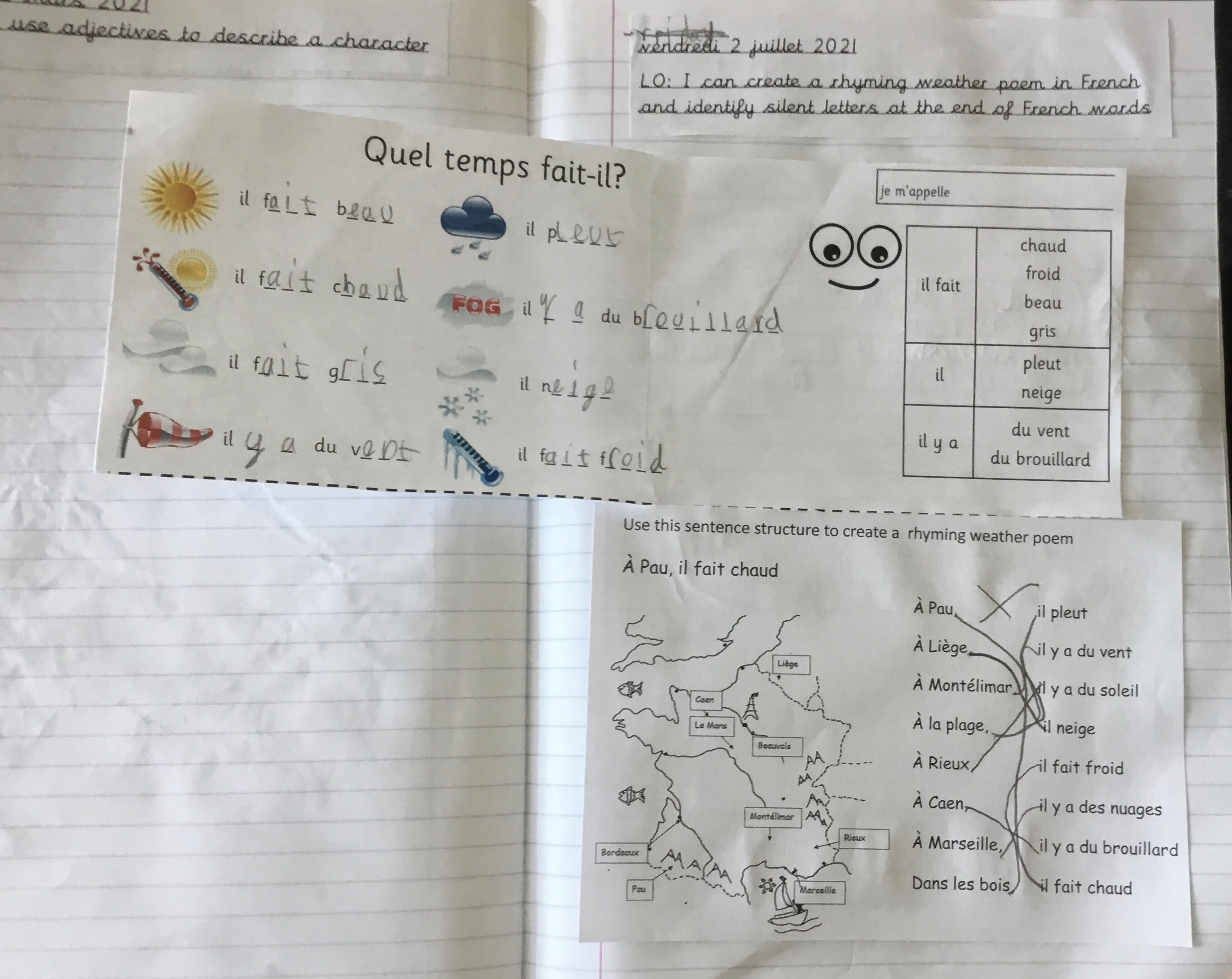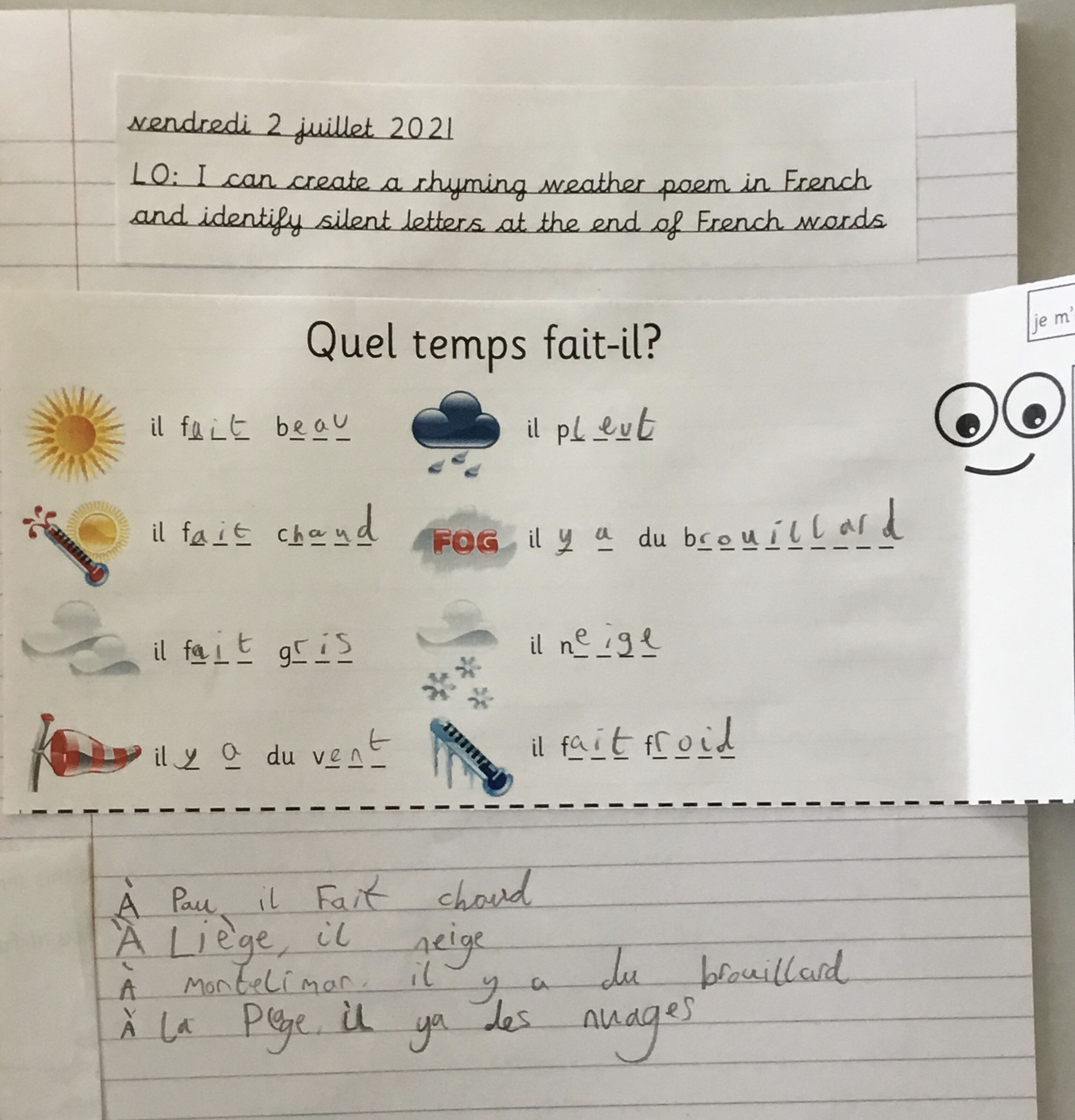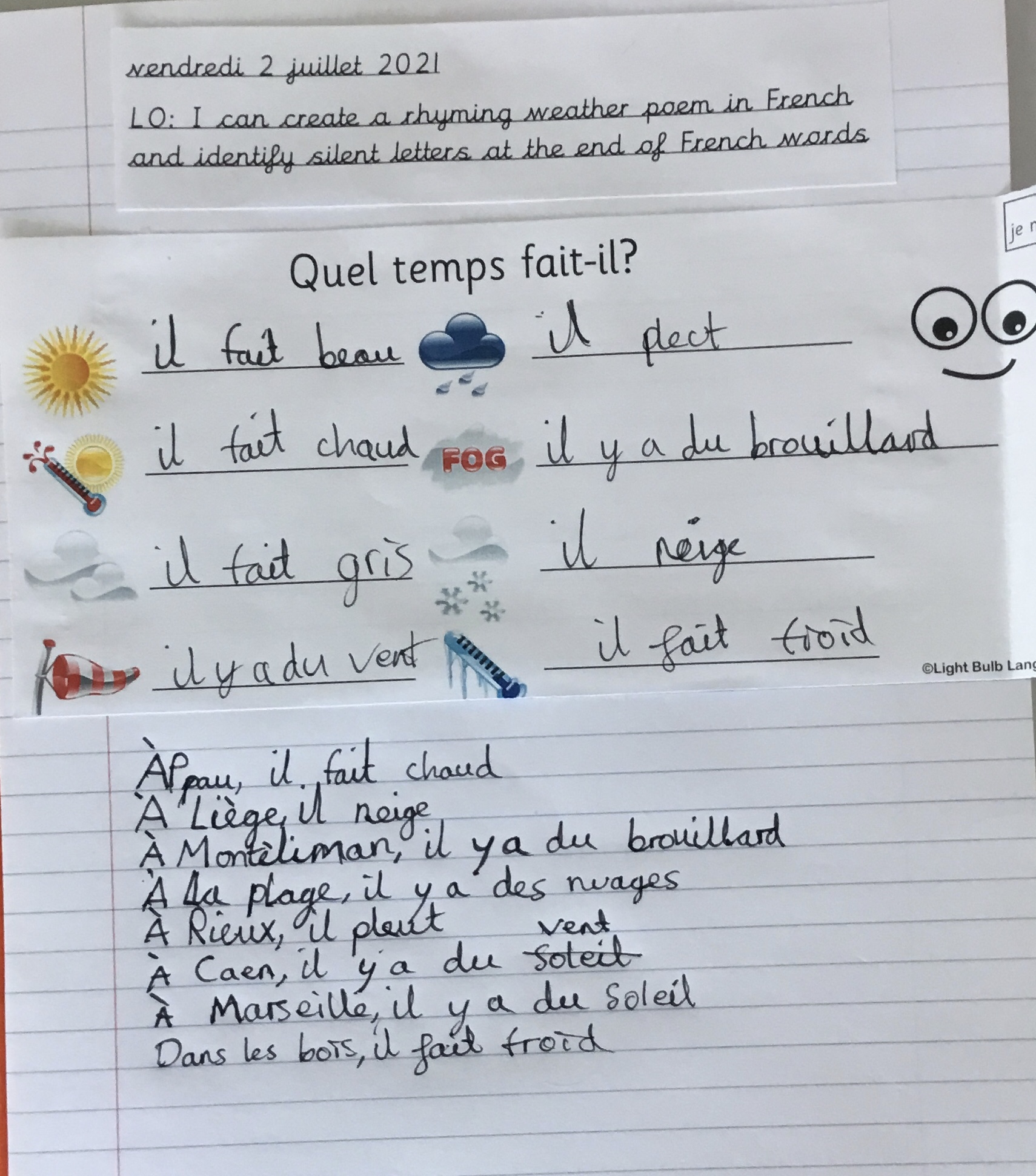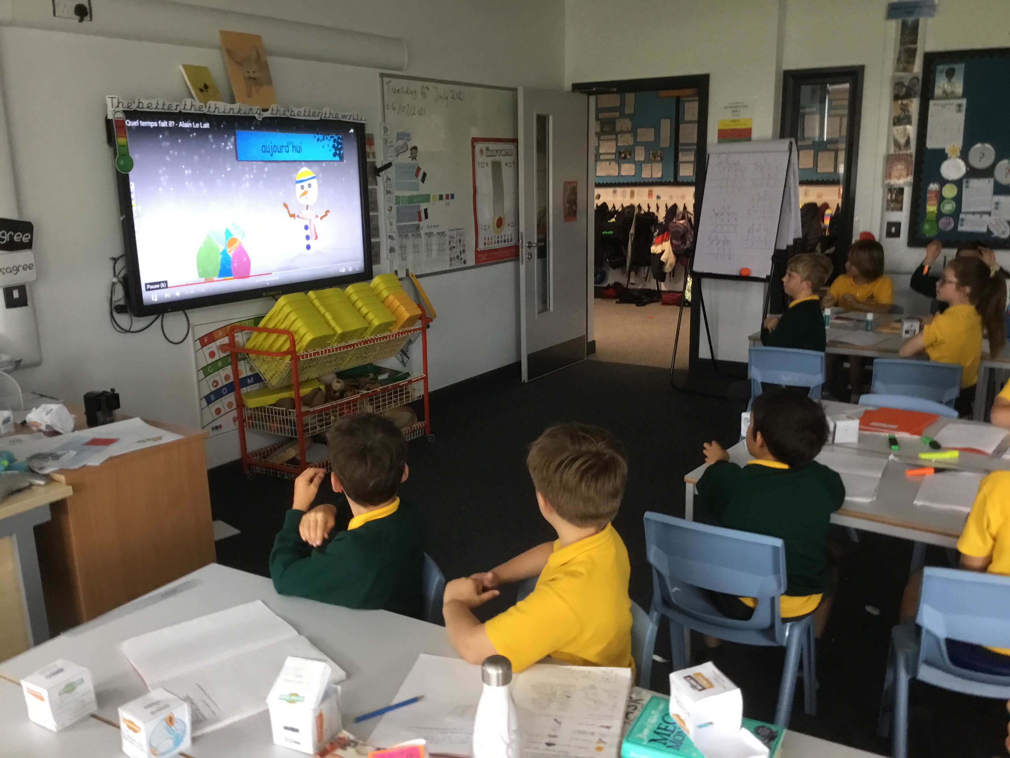 Year 4 learnt the vocabulary associated with answering the question: what is the weather today? They practised the sentences whilst miming actions. They then matched pictures to the sentences. They also wrote some sentences using a given sentence structure about what the weather was like in different cities in France.