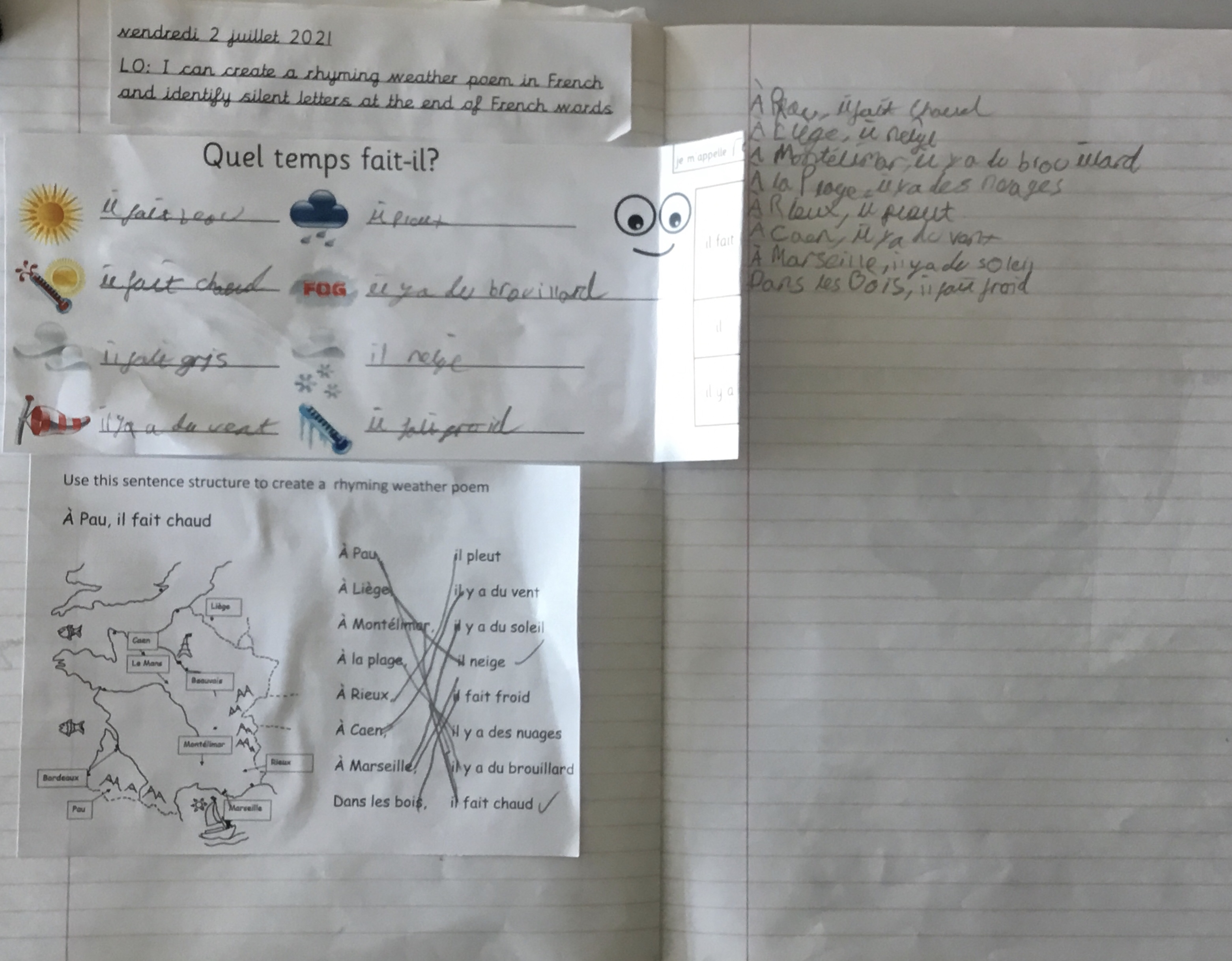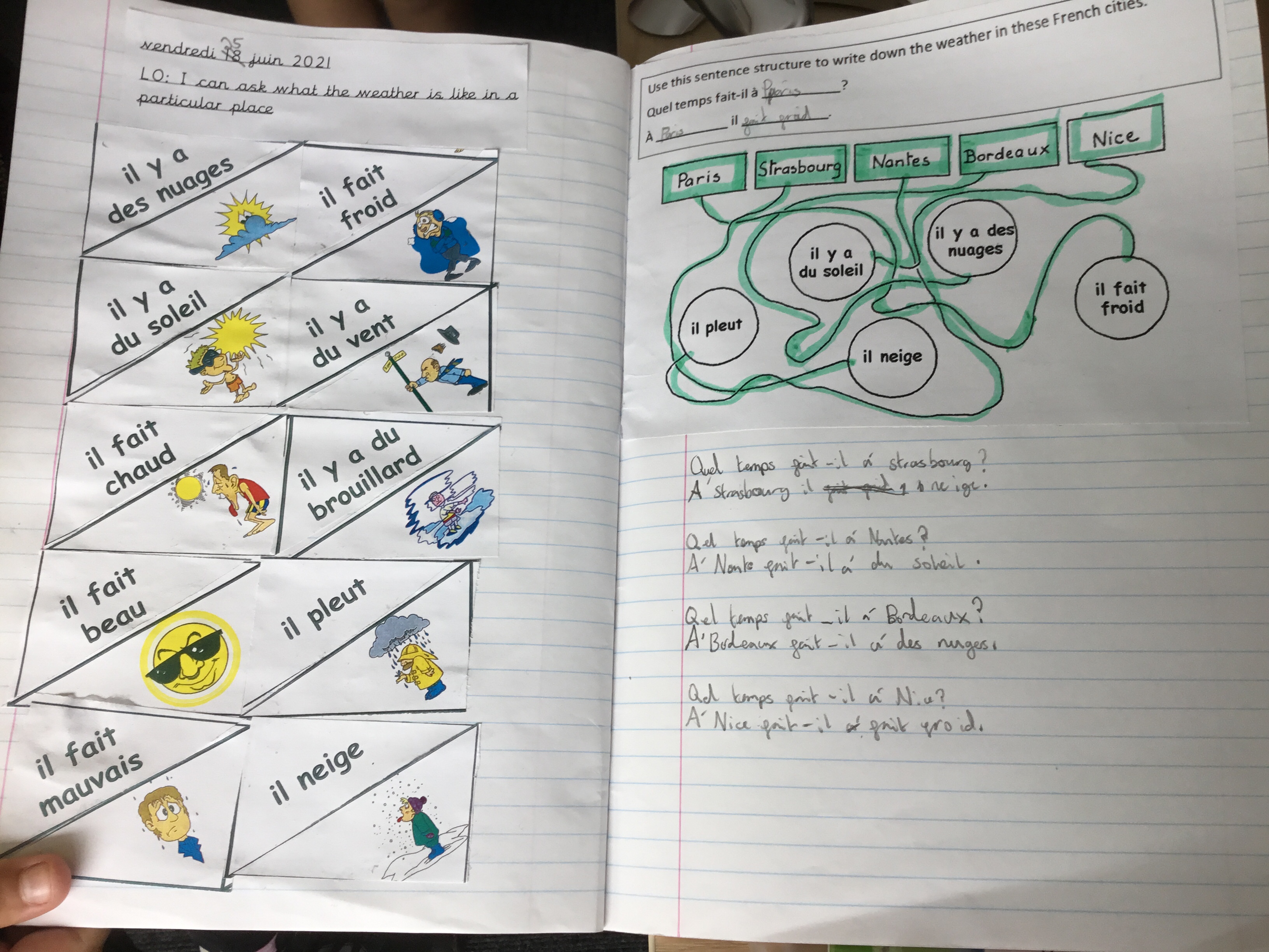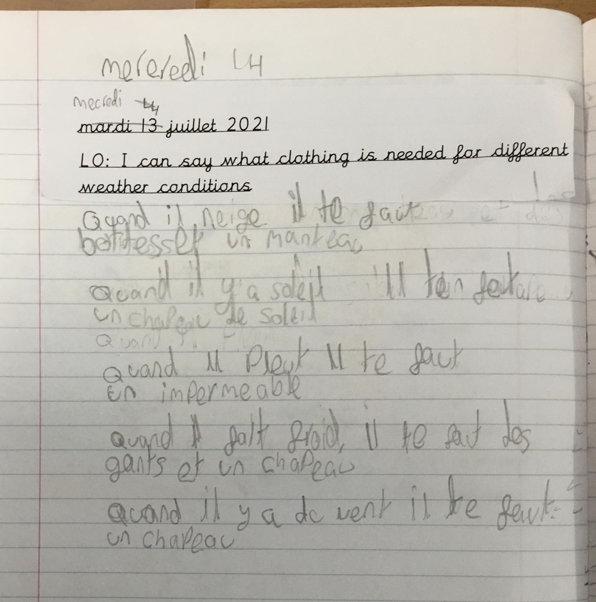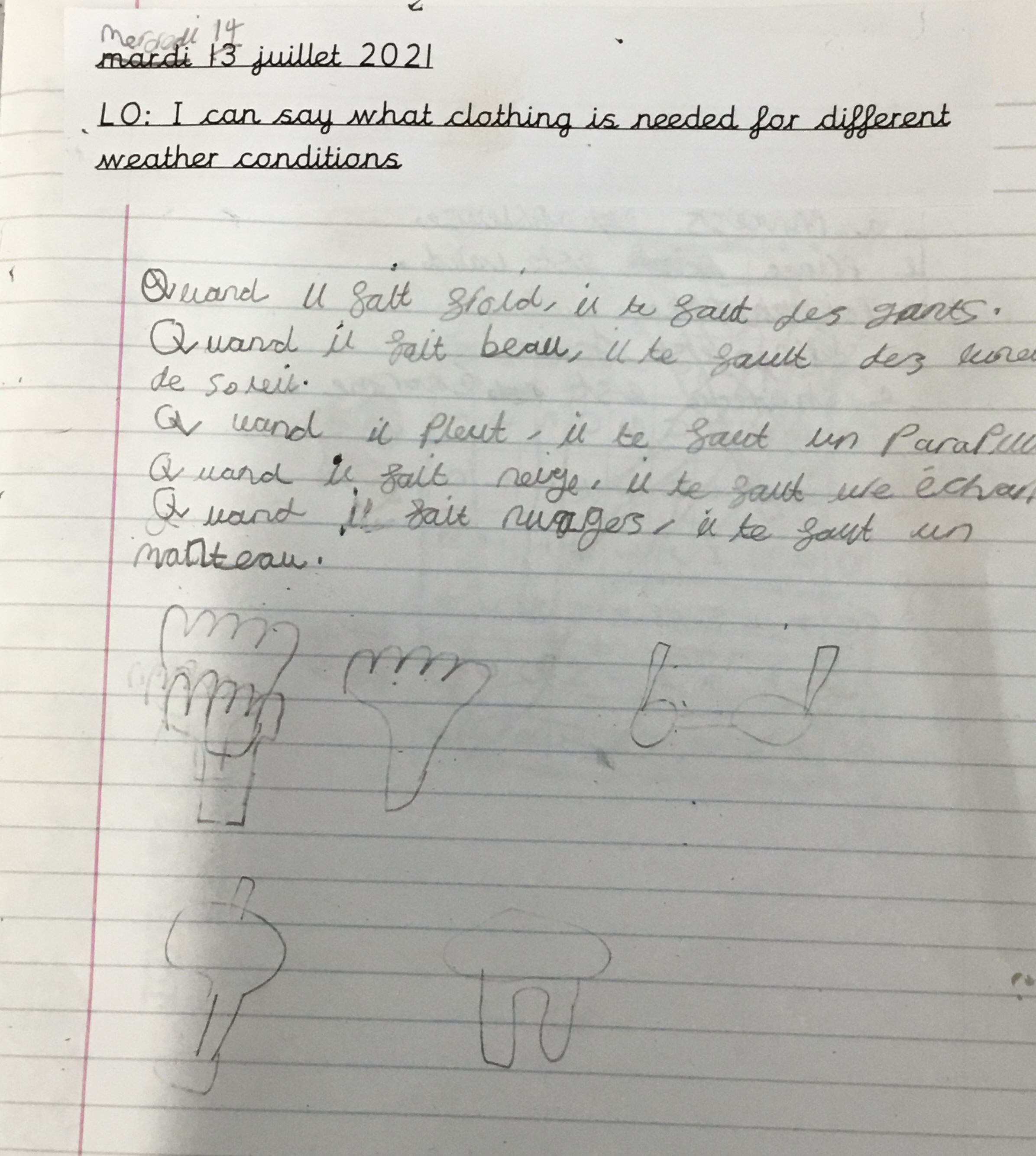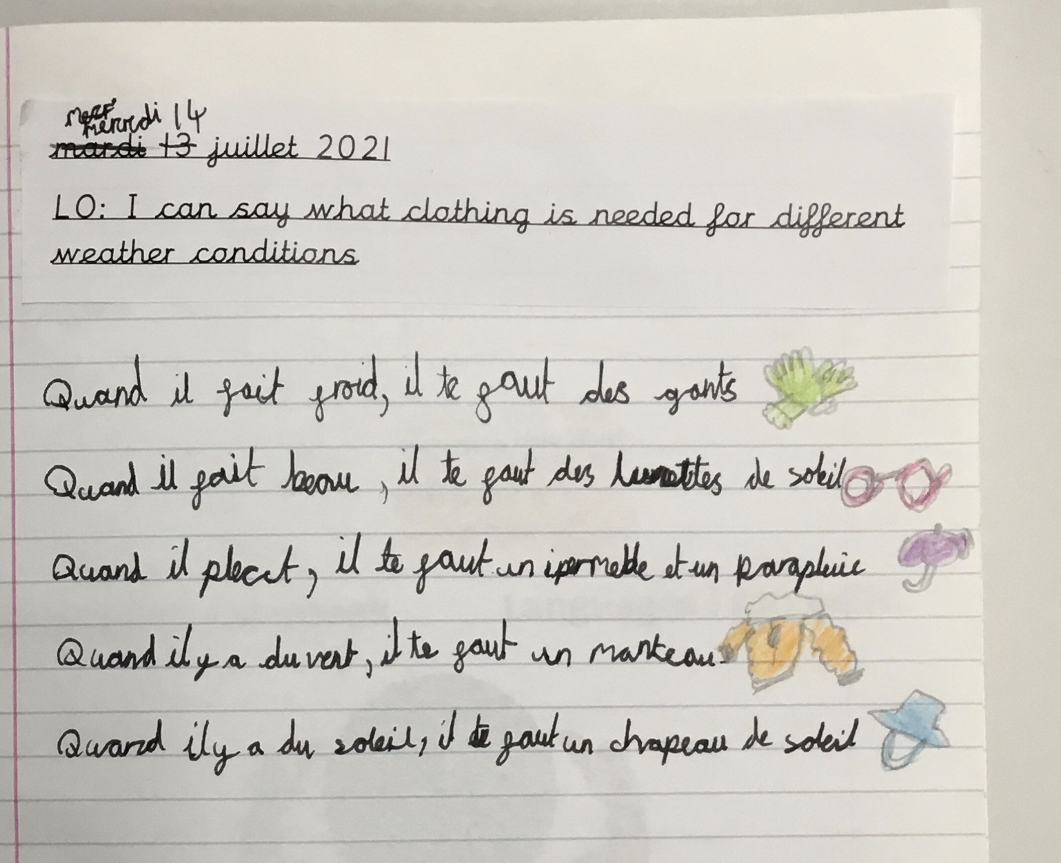 Year 4 learnt the vocabulary associated with answering the question: what is the weather today? They practised the sentences whilst miming actions. They then matched pictures to the sentences. They also wrote some sentences using a given sentence structure about what the weather was like in different cities in France.