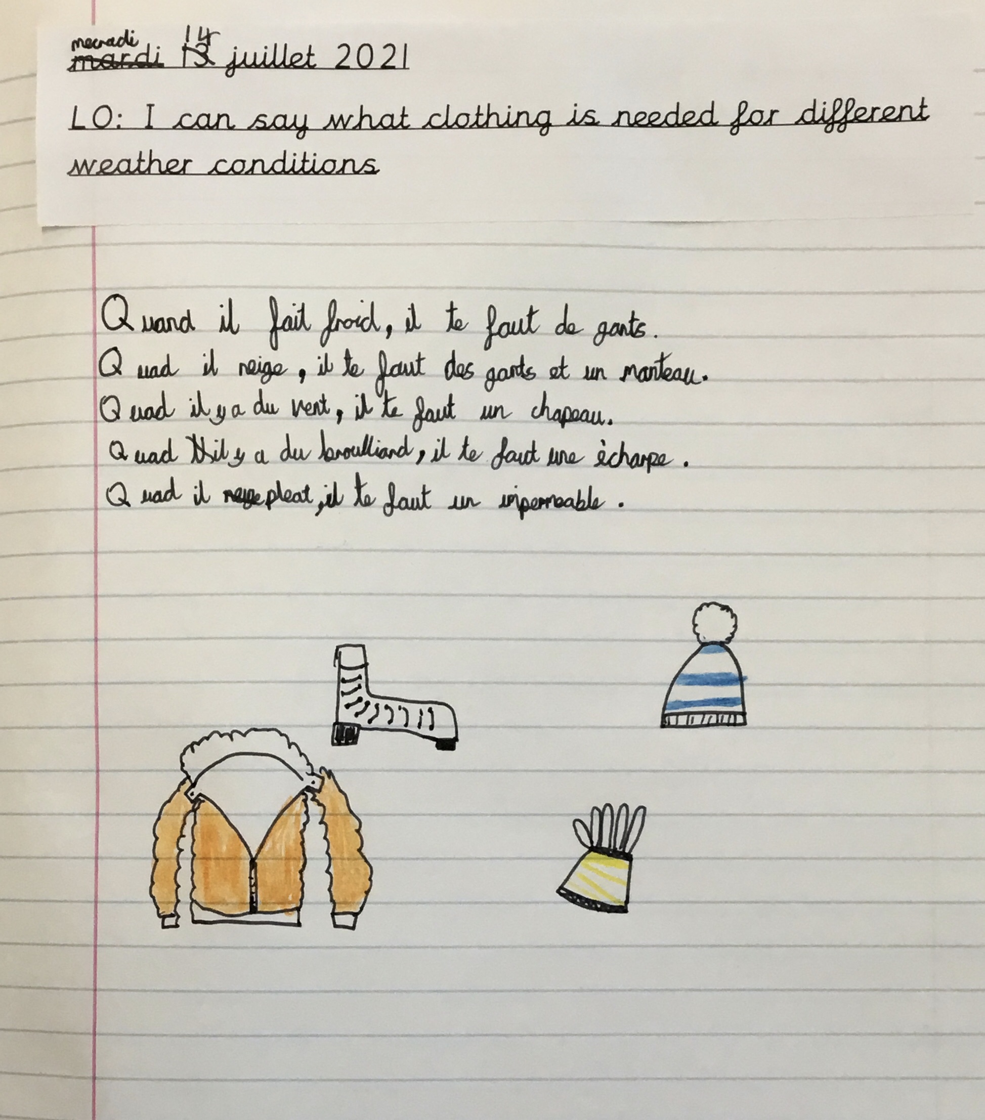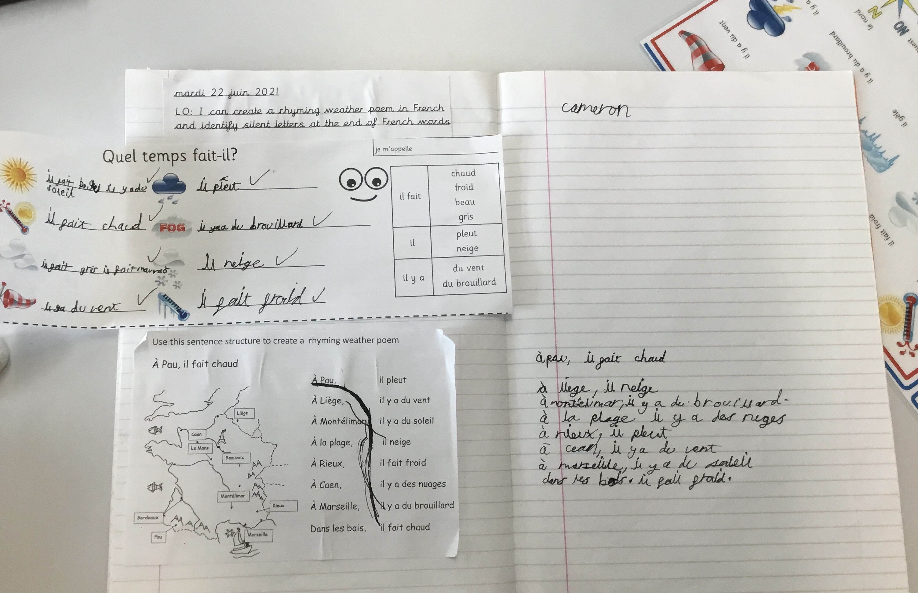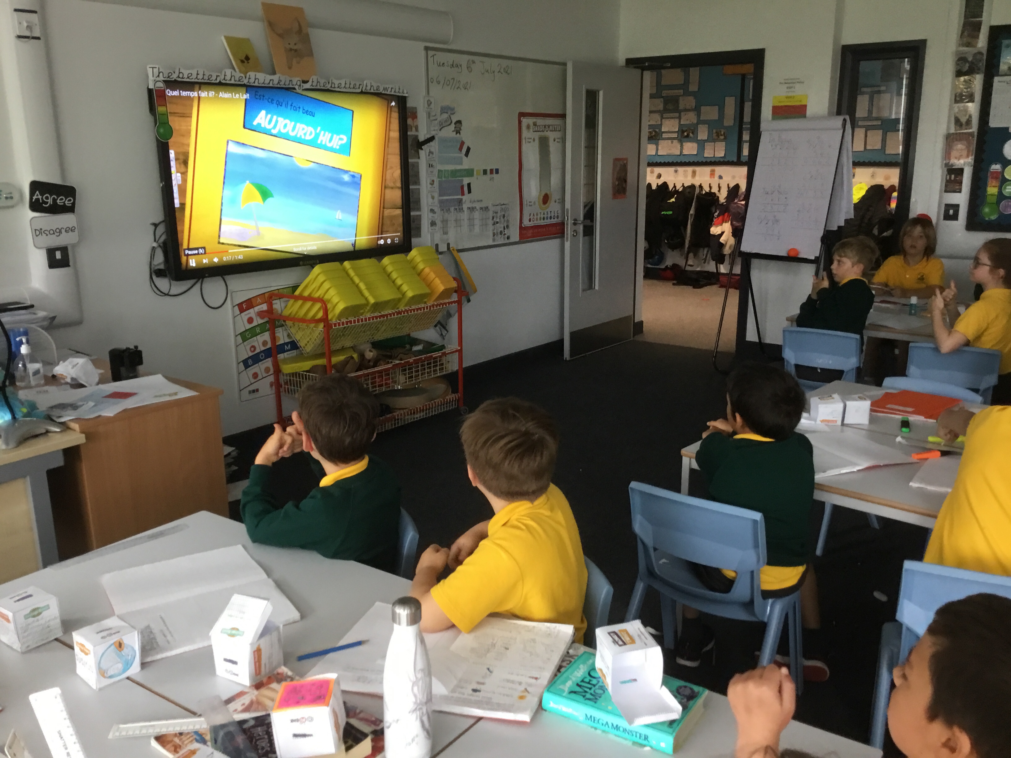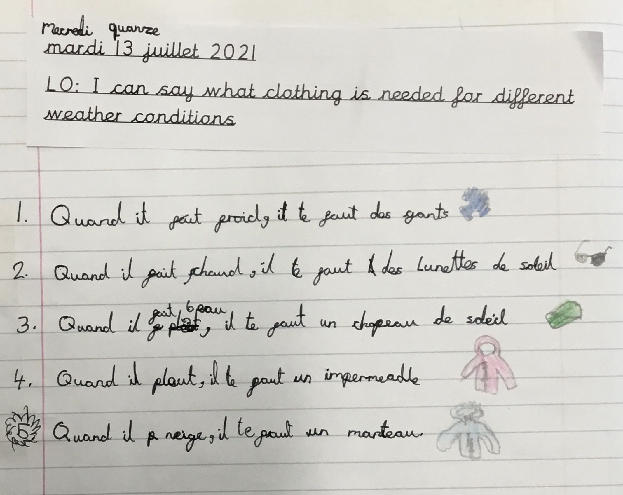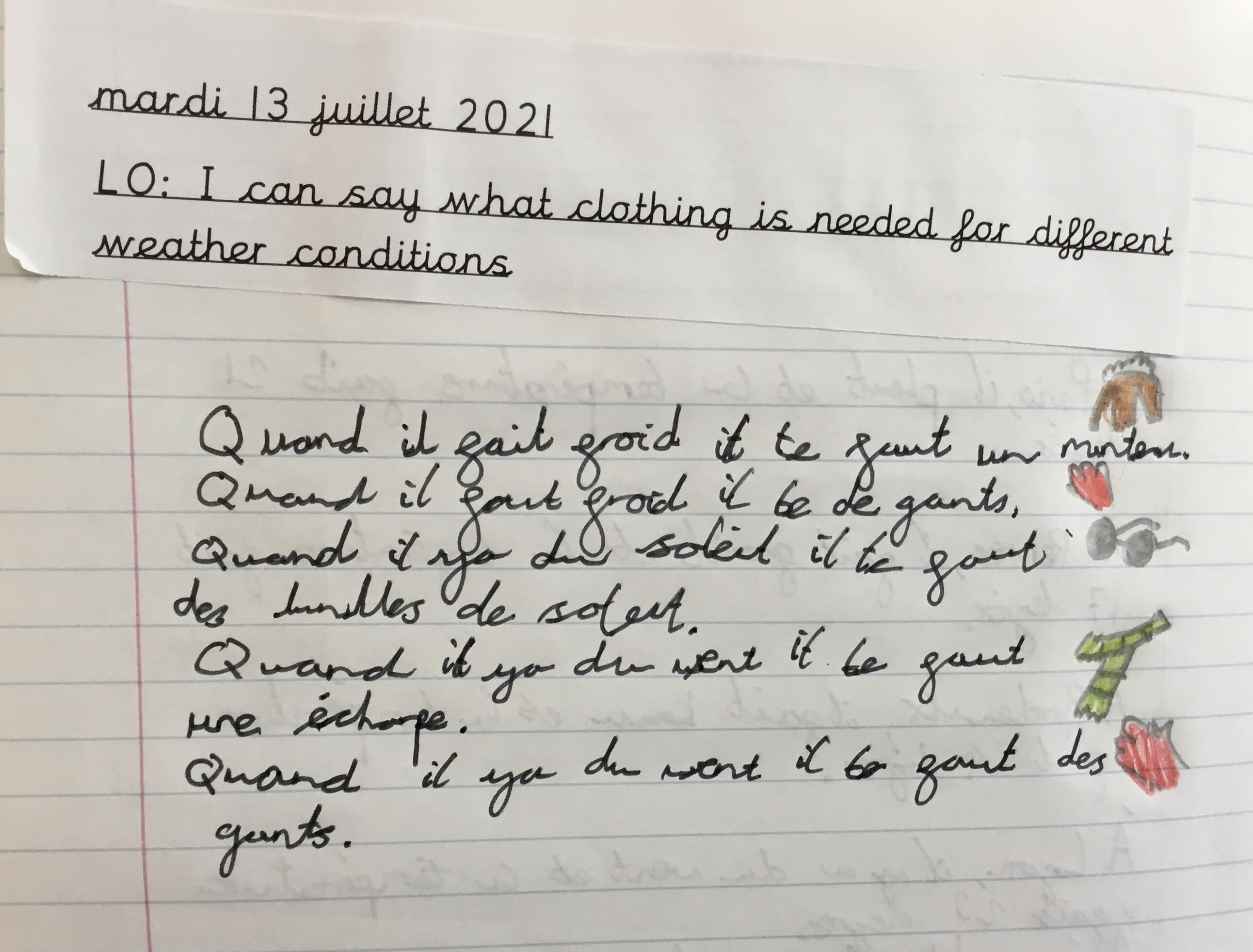 Year 4 learnt the vocabulary associated with answering the question: what is the weather today? They practised the sentences whilst miming actions. They then matched pictures to the sentences. They also wrote some sentences using a given sentence structure about what the weather was like in different cities in France.