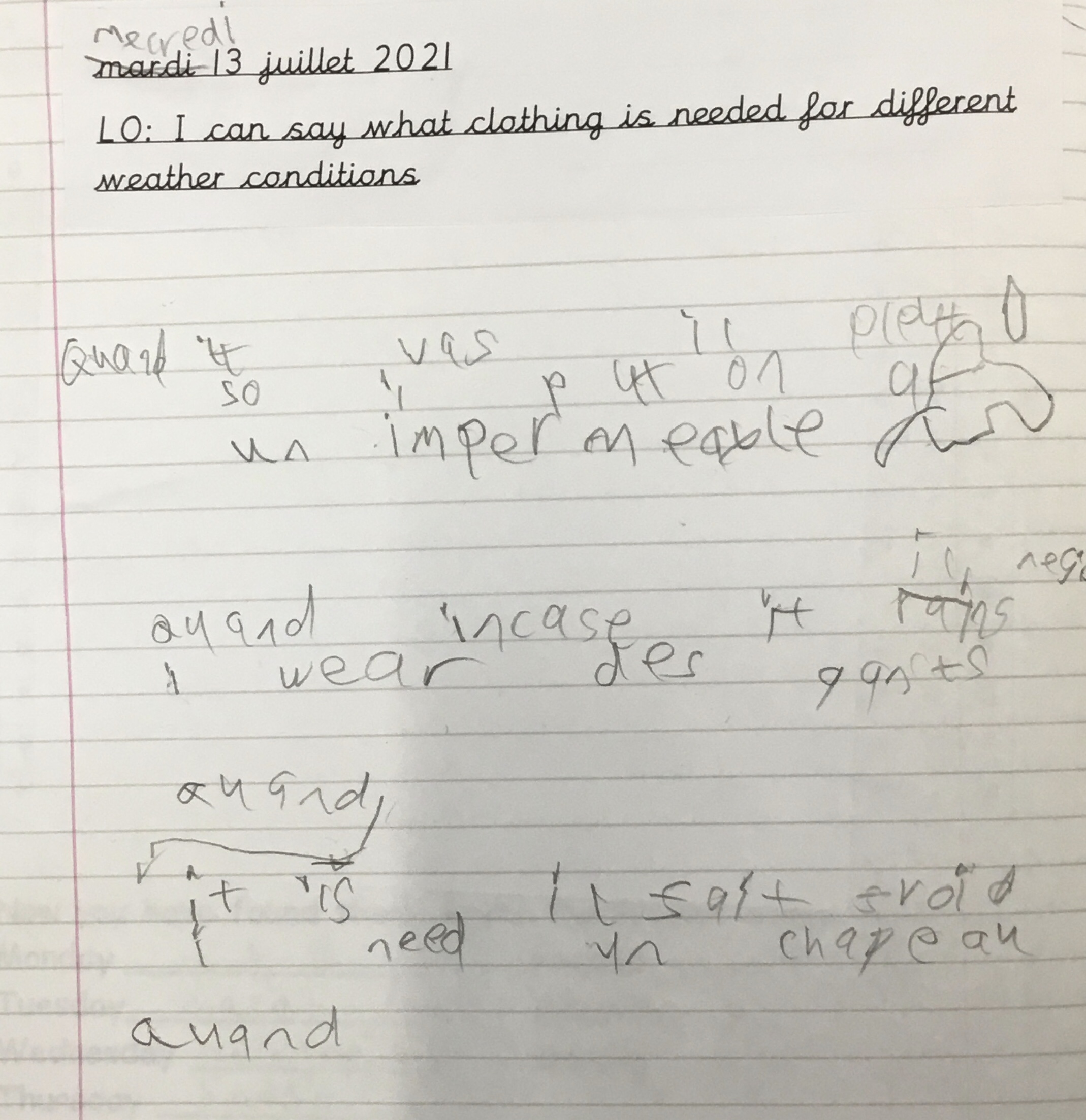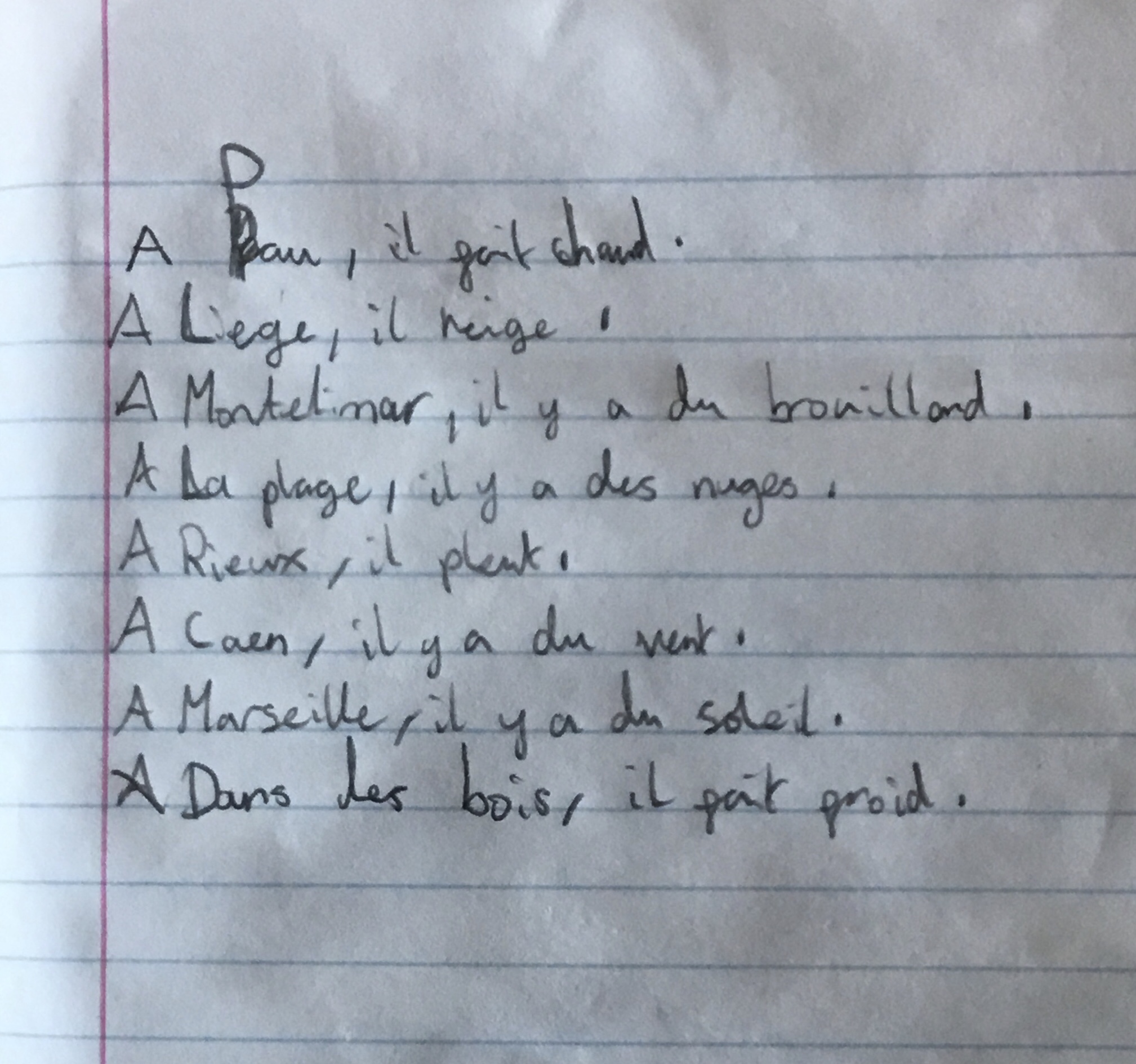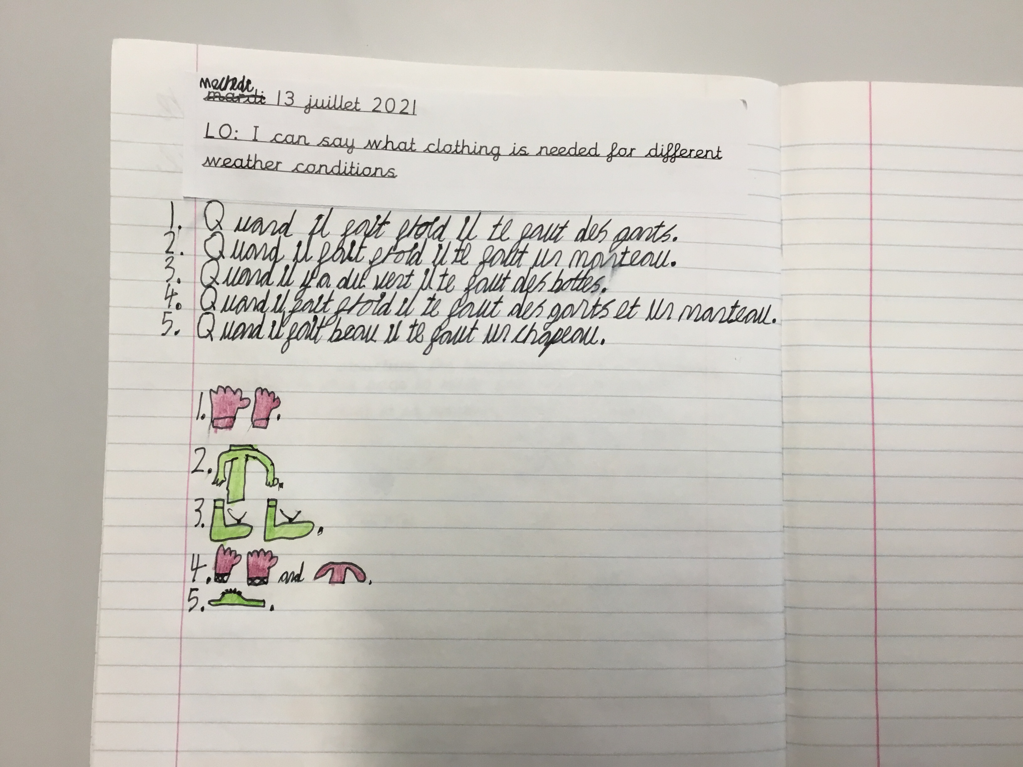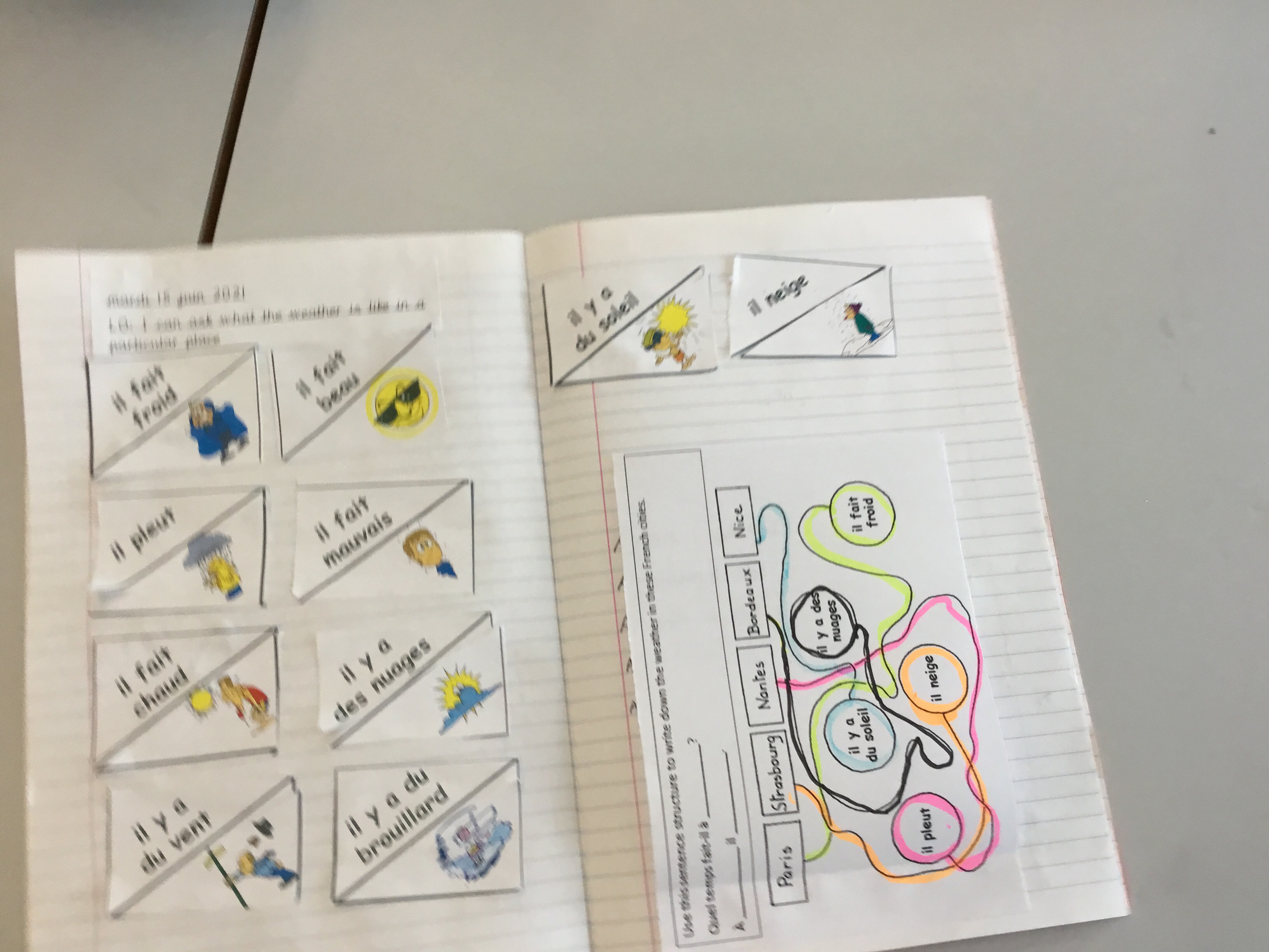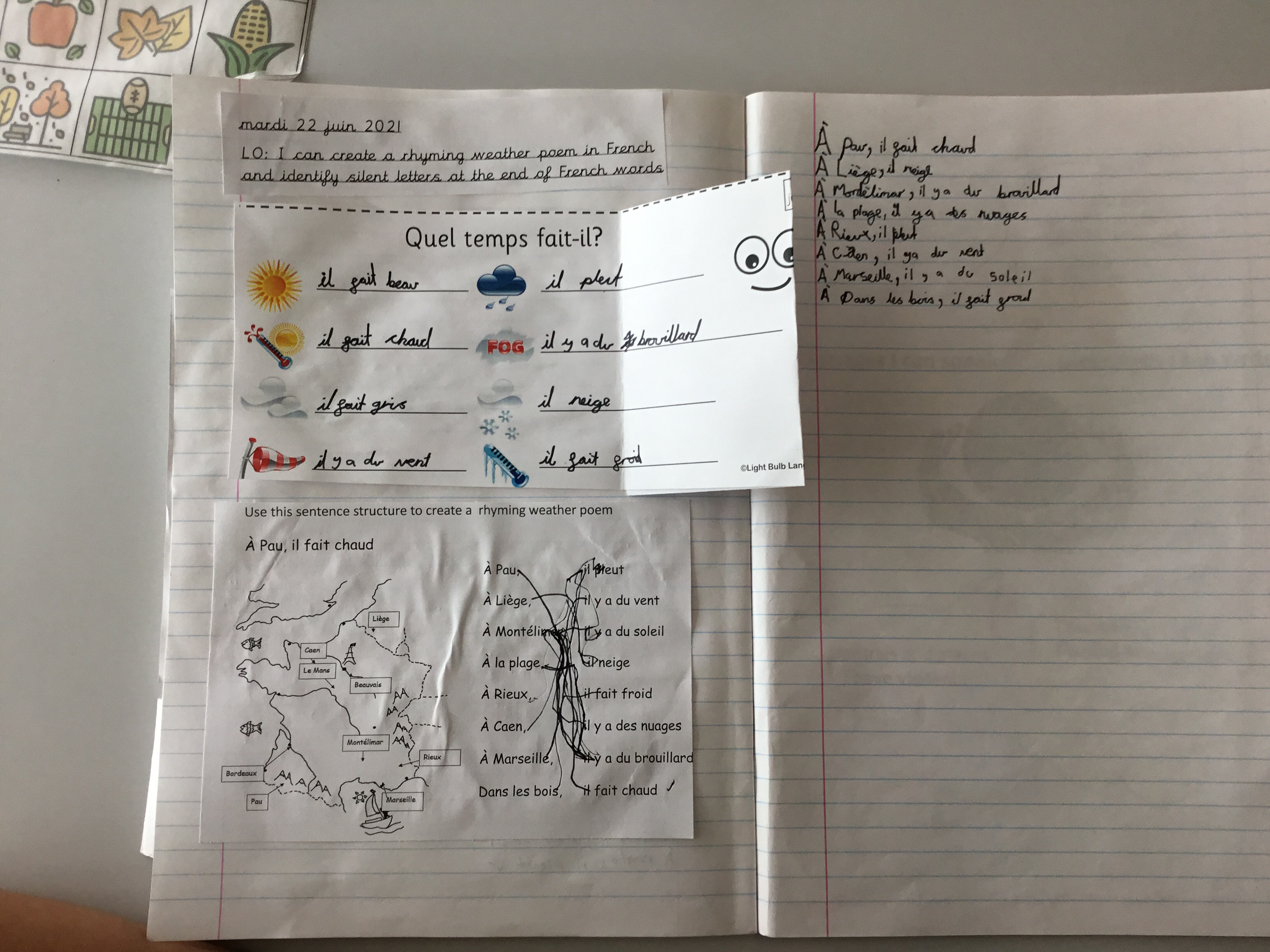 Year 4 learnt the vocabulary associated with answering the question: what is the weather today? They practised the sentences whilst miming actions. They then matched pictures to the sentences. They also wrote some sentences using a given sentence structure about what the weather was like in different cities in France.