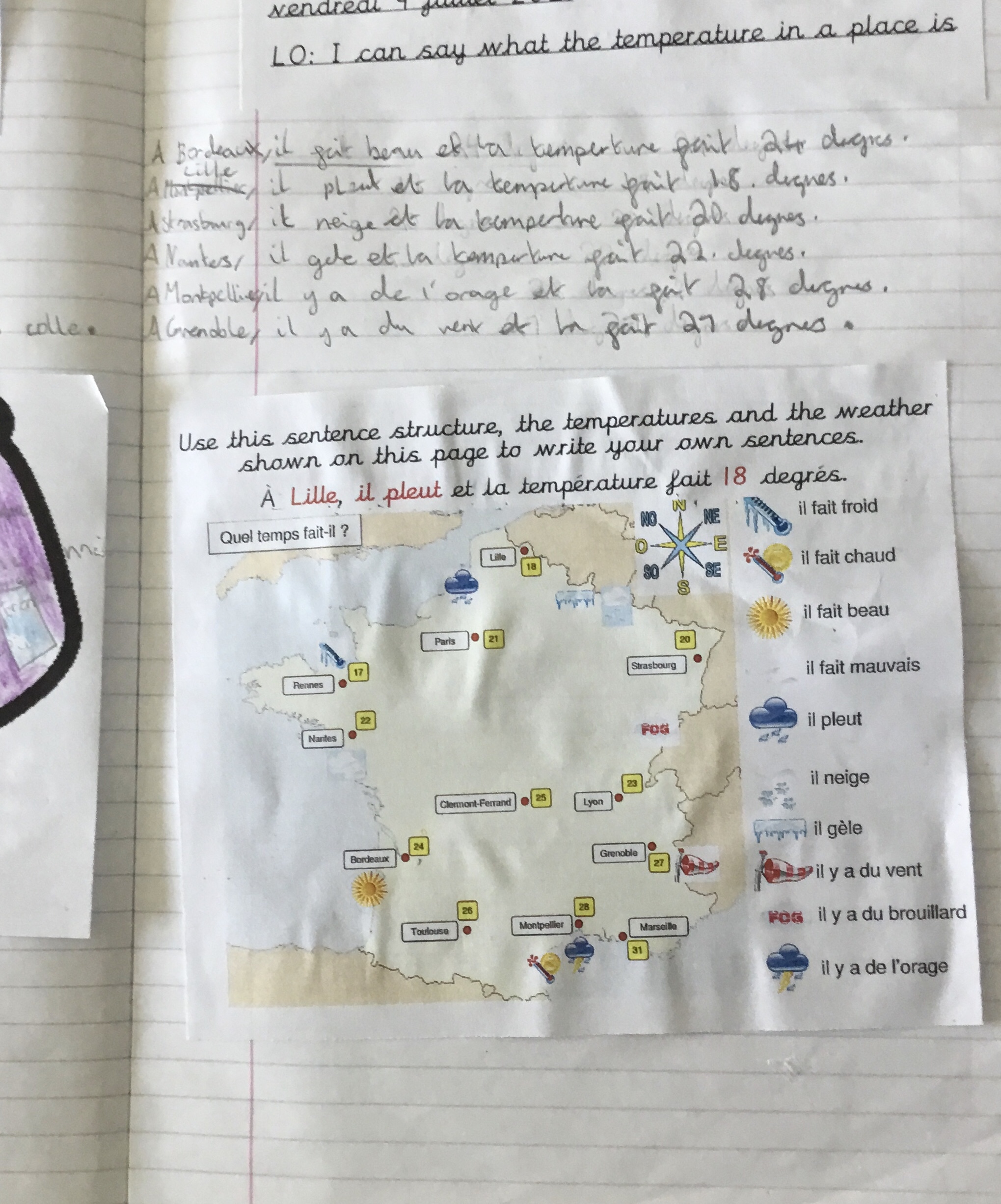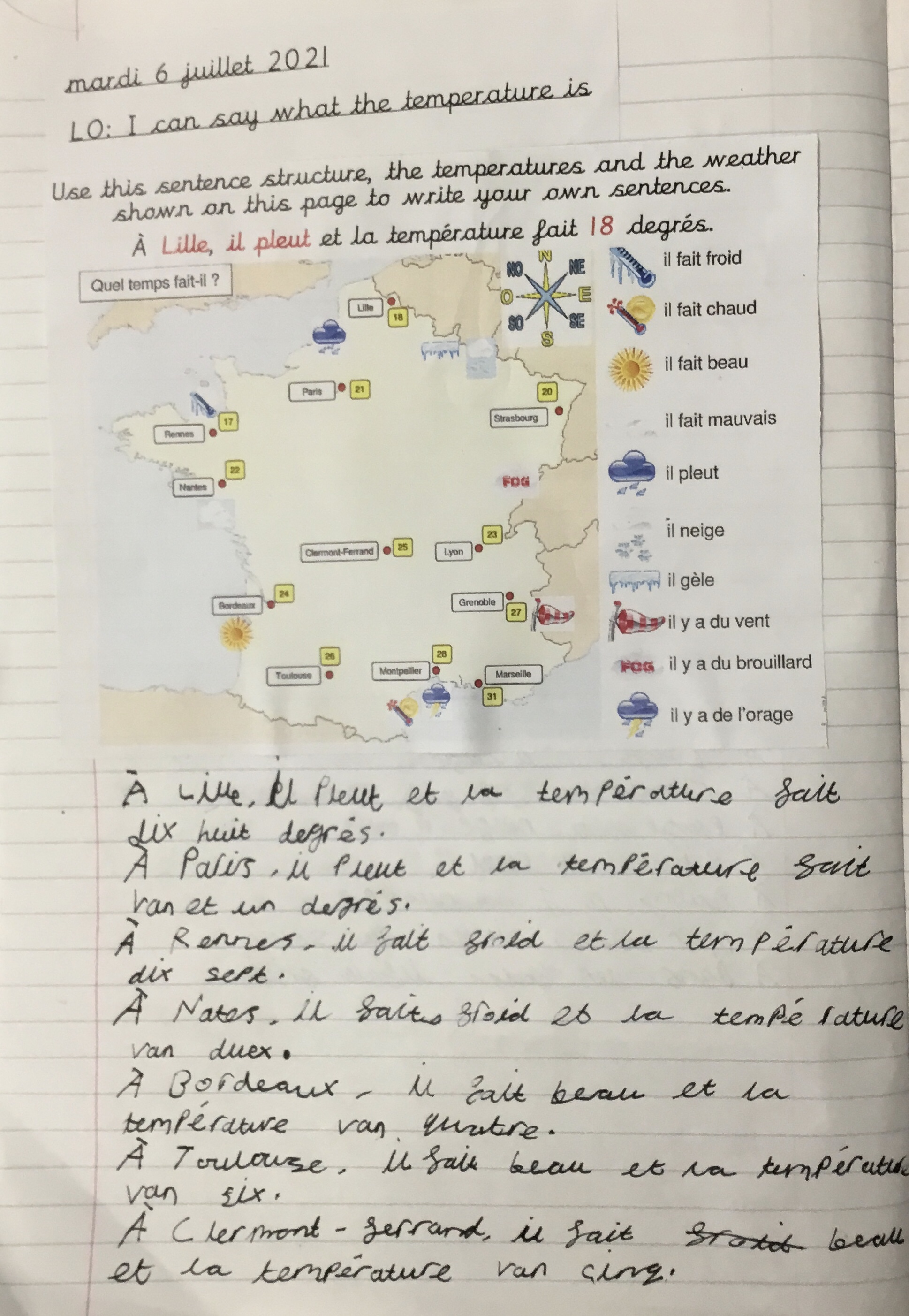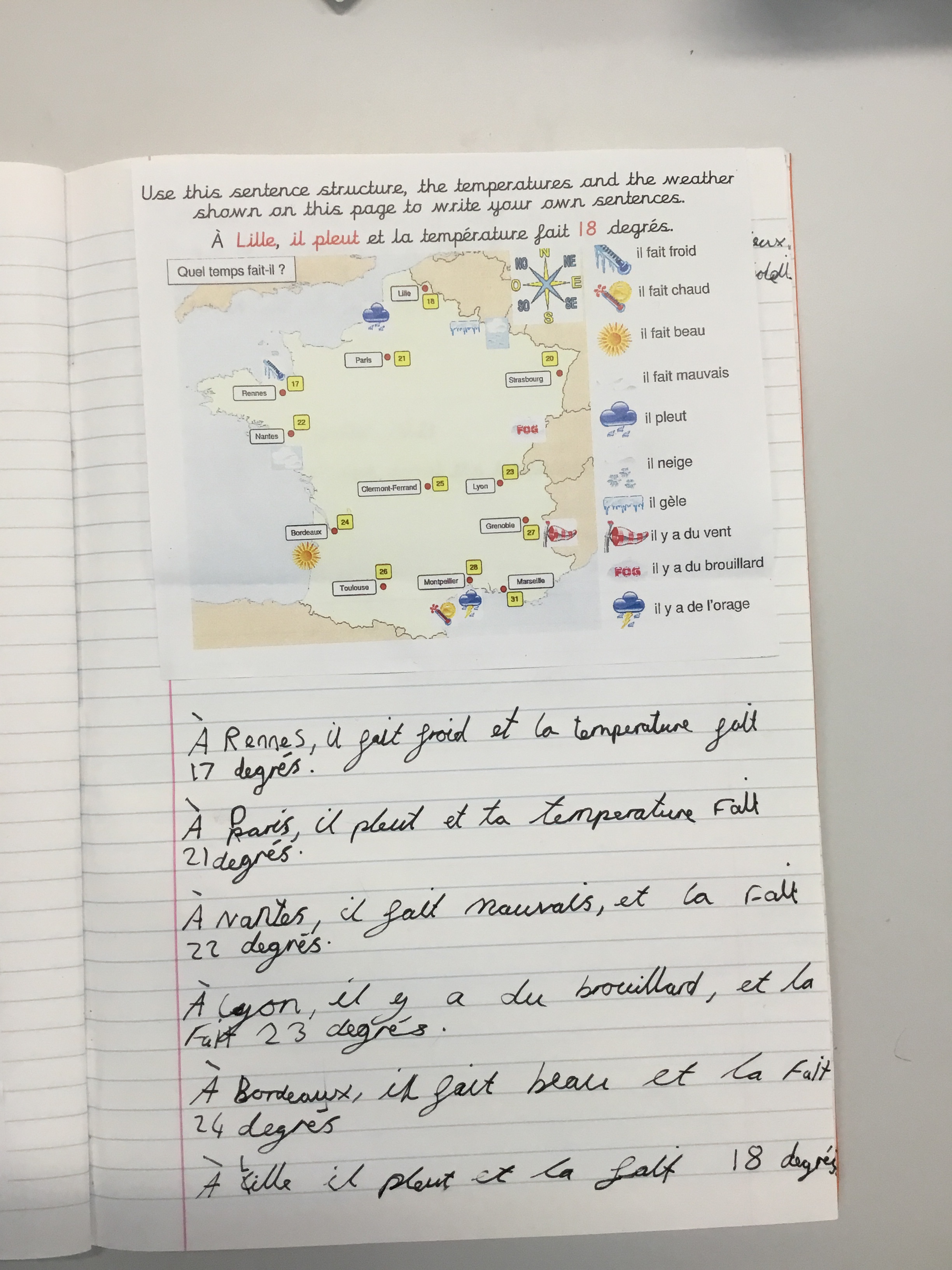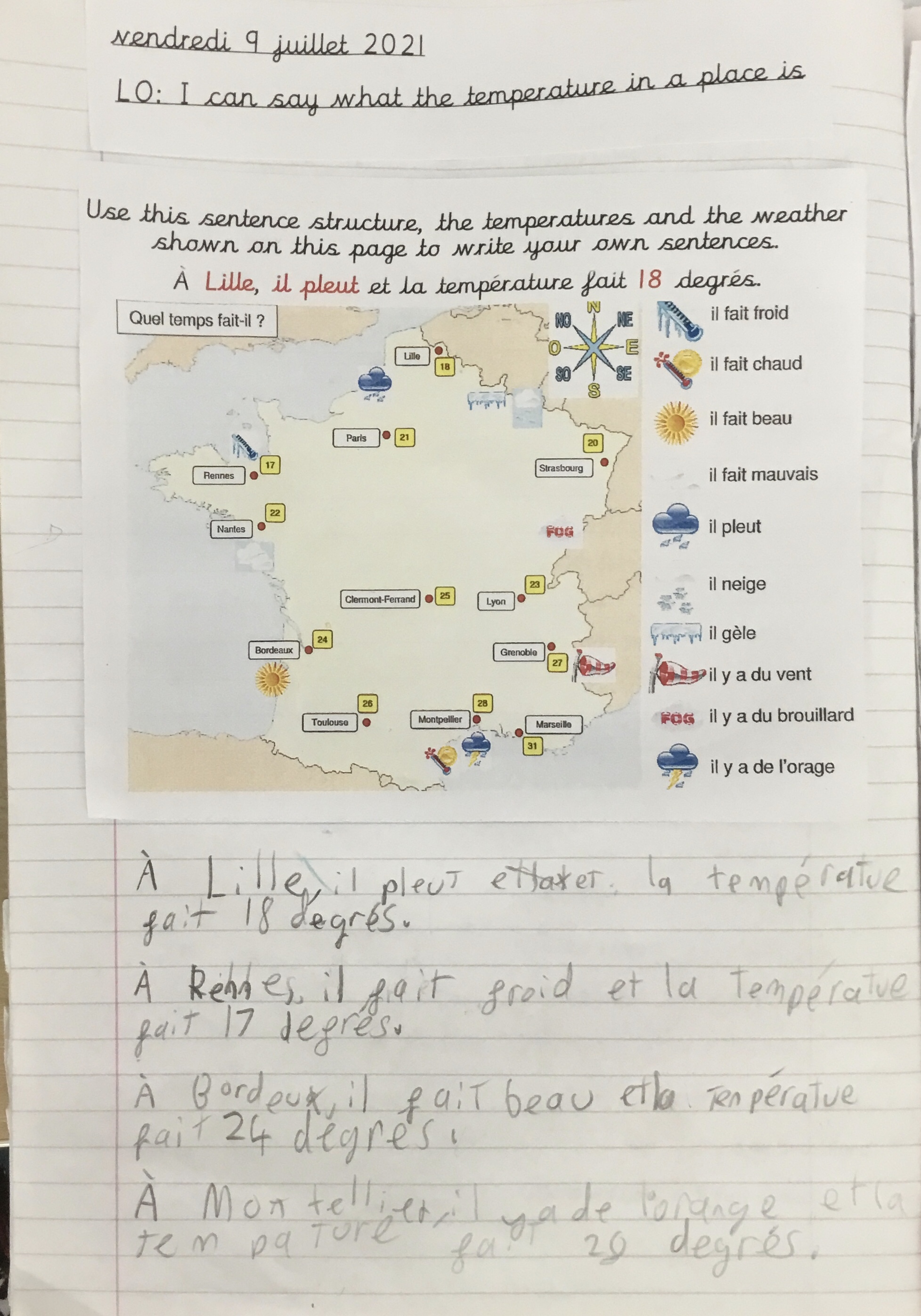 Year 4 practised numbers up to 40. They then learnt how to say the temperature using the French word for degrees and for minus temperatures. They then looked at a map of France, reading and then writing some sentences stating what the weather was like and what the temperature was using a given sentence structure.