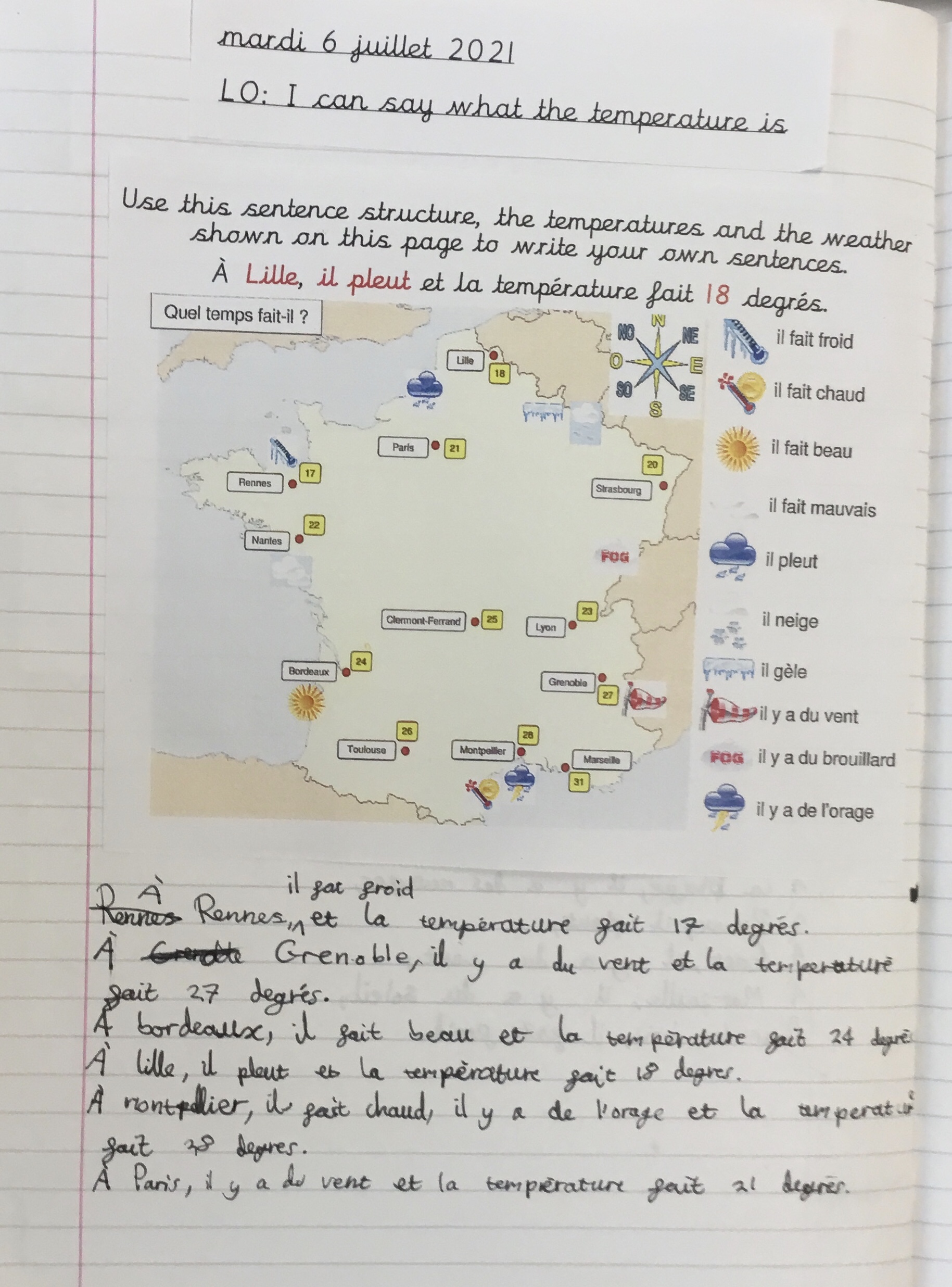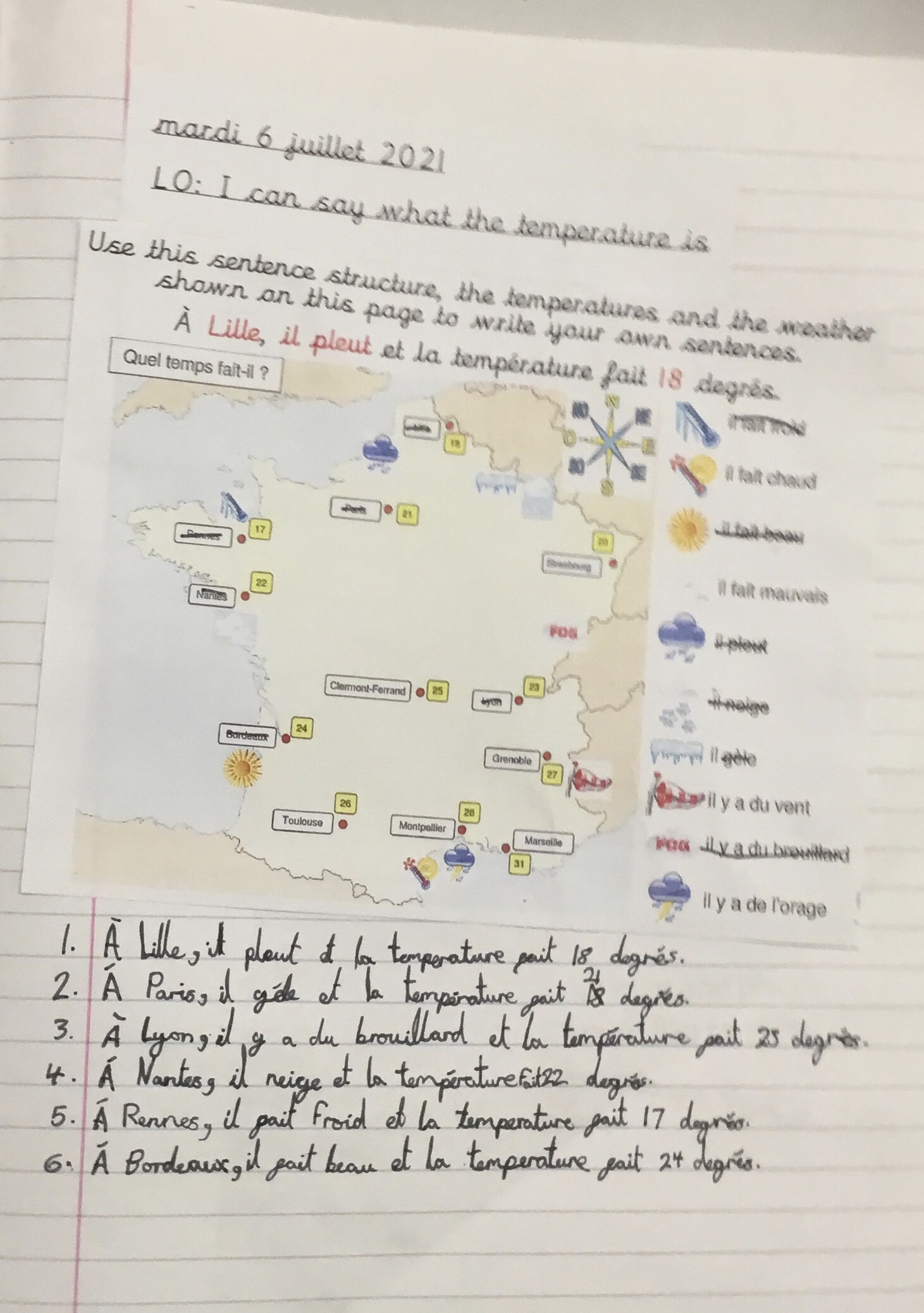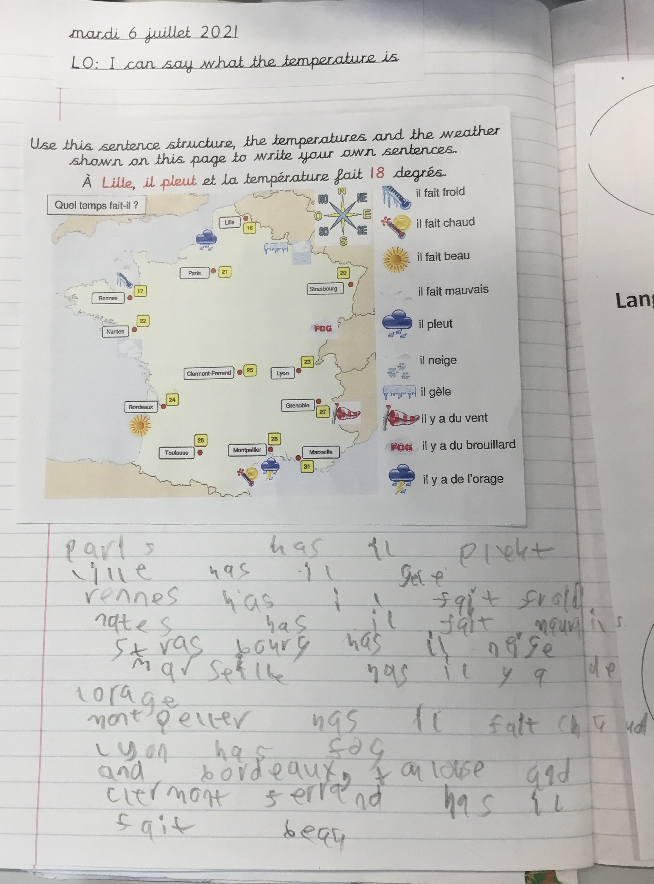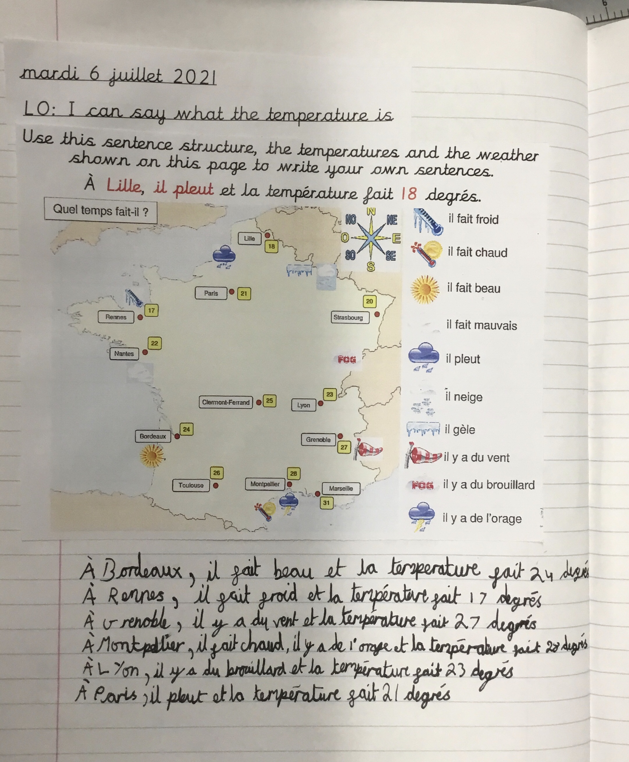 Year 4 practised numbers up to 40. They then learnt how to say the temperature using the French word for degrees and for minus temperatures. They then looked at a map of France, reading and then writing some sentences stating what the weather was like and what the temperature was using a given sentence structure.