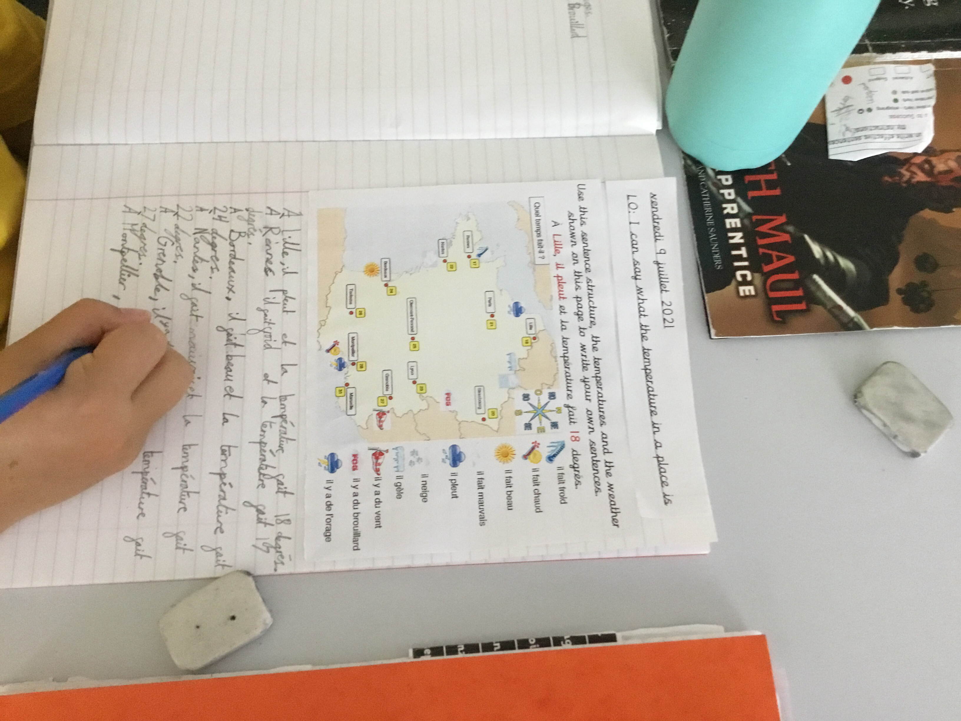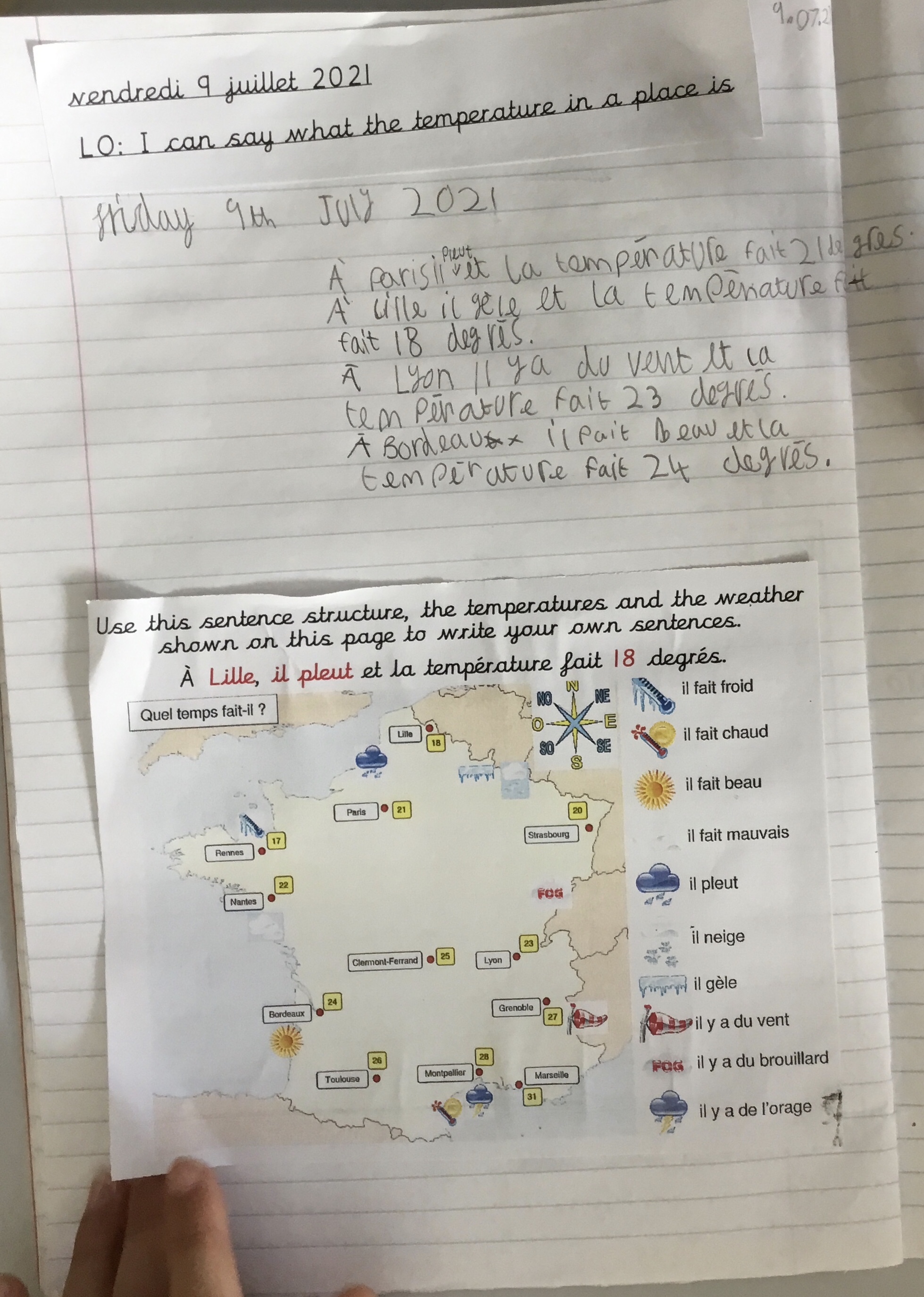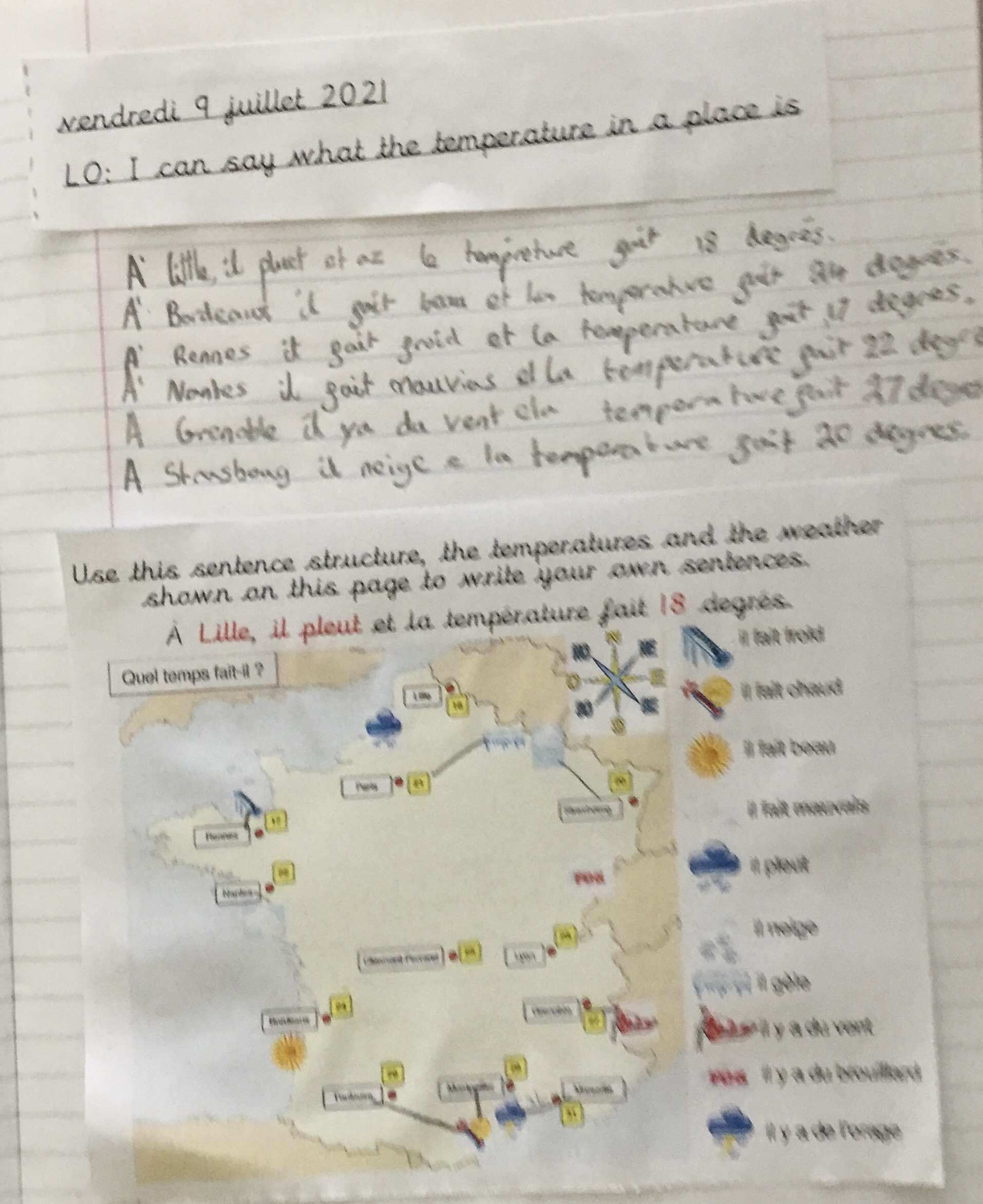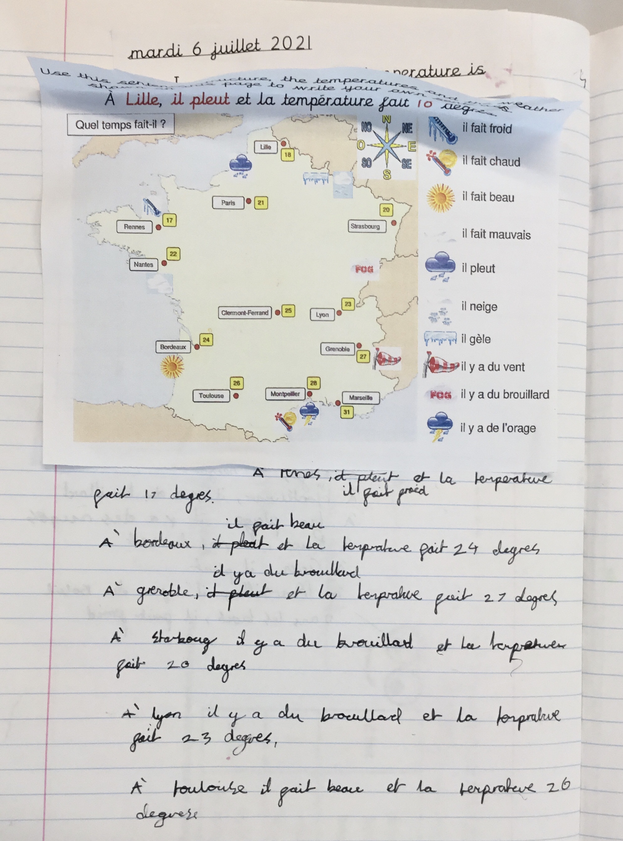 Year 4 practised numbers up to 40. They then learnt how to say the temperature using the French word for degrees and for minus temperatures. They then looked at a map of France, reading and then writing some sentences stating what the weather was like and what the temperature was using a given sentence structure.