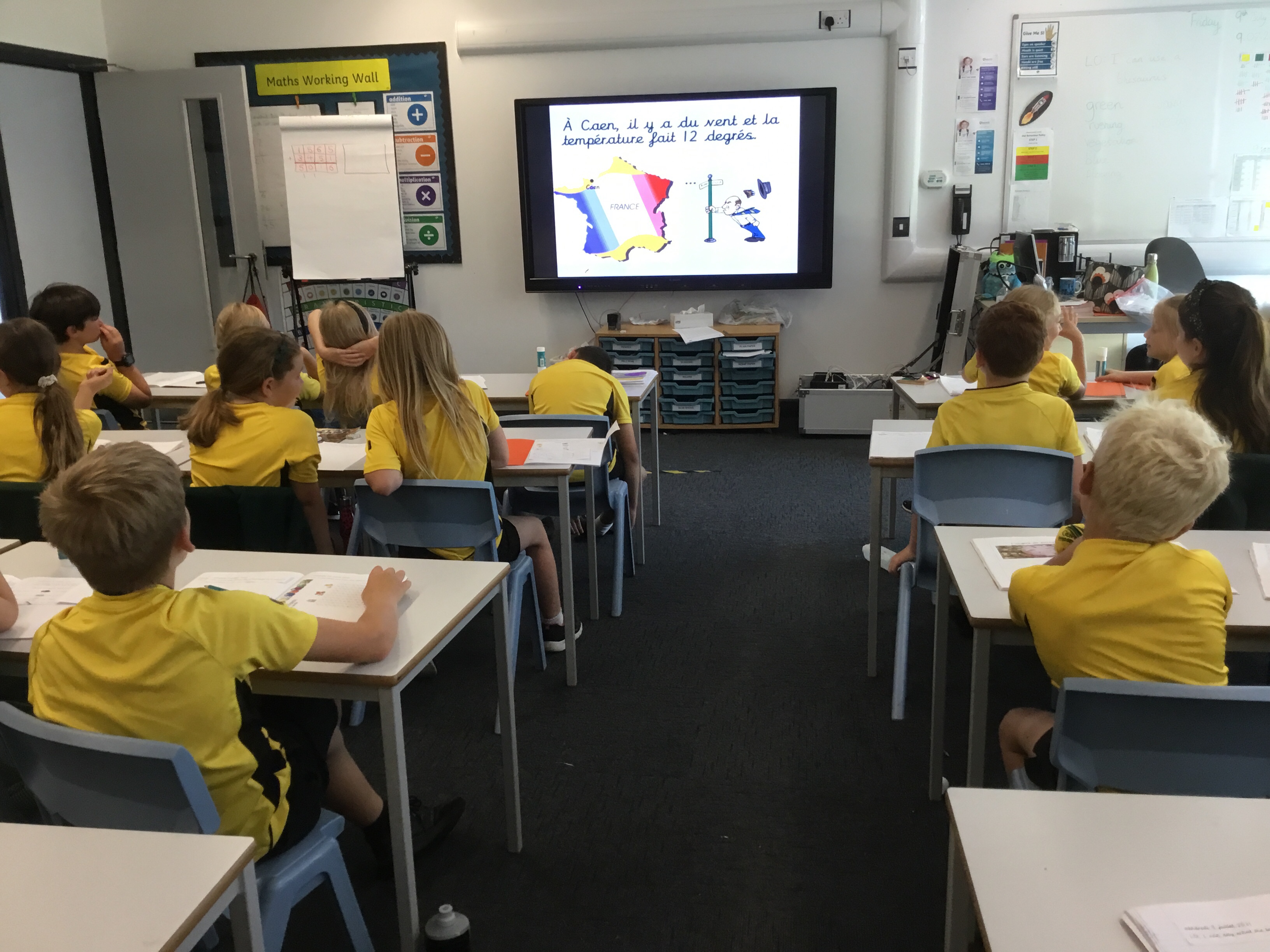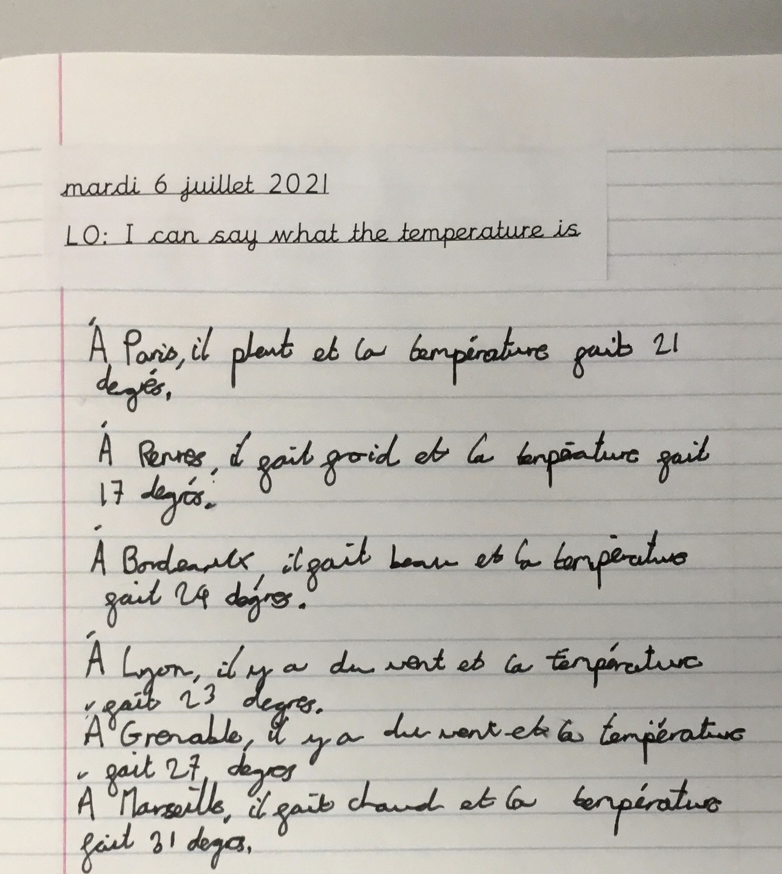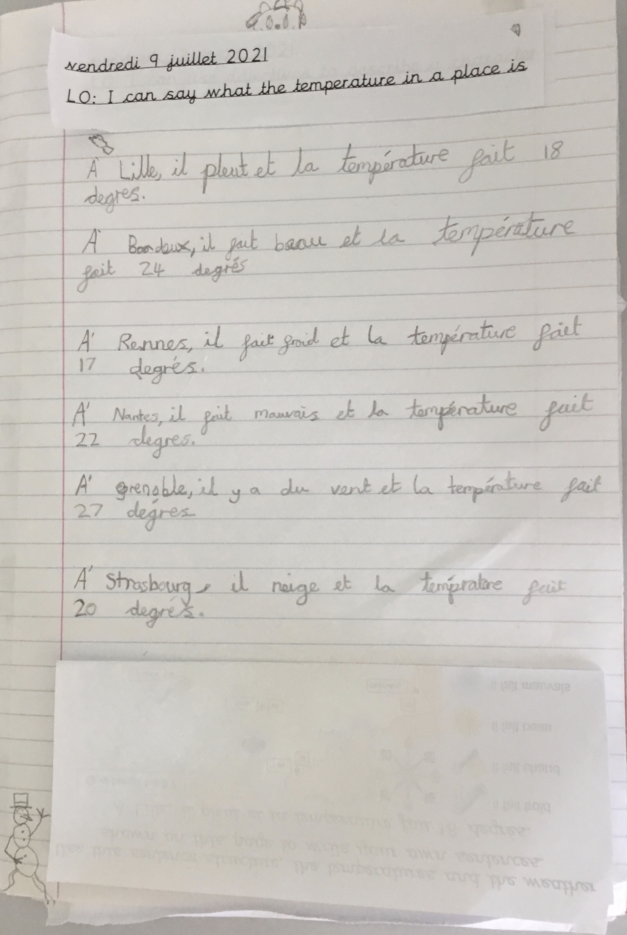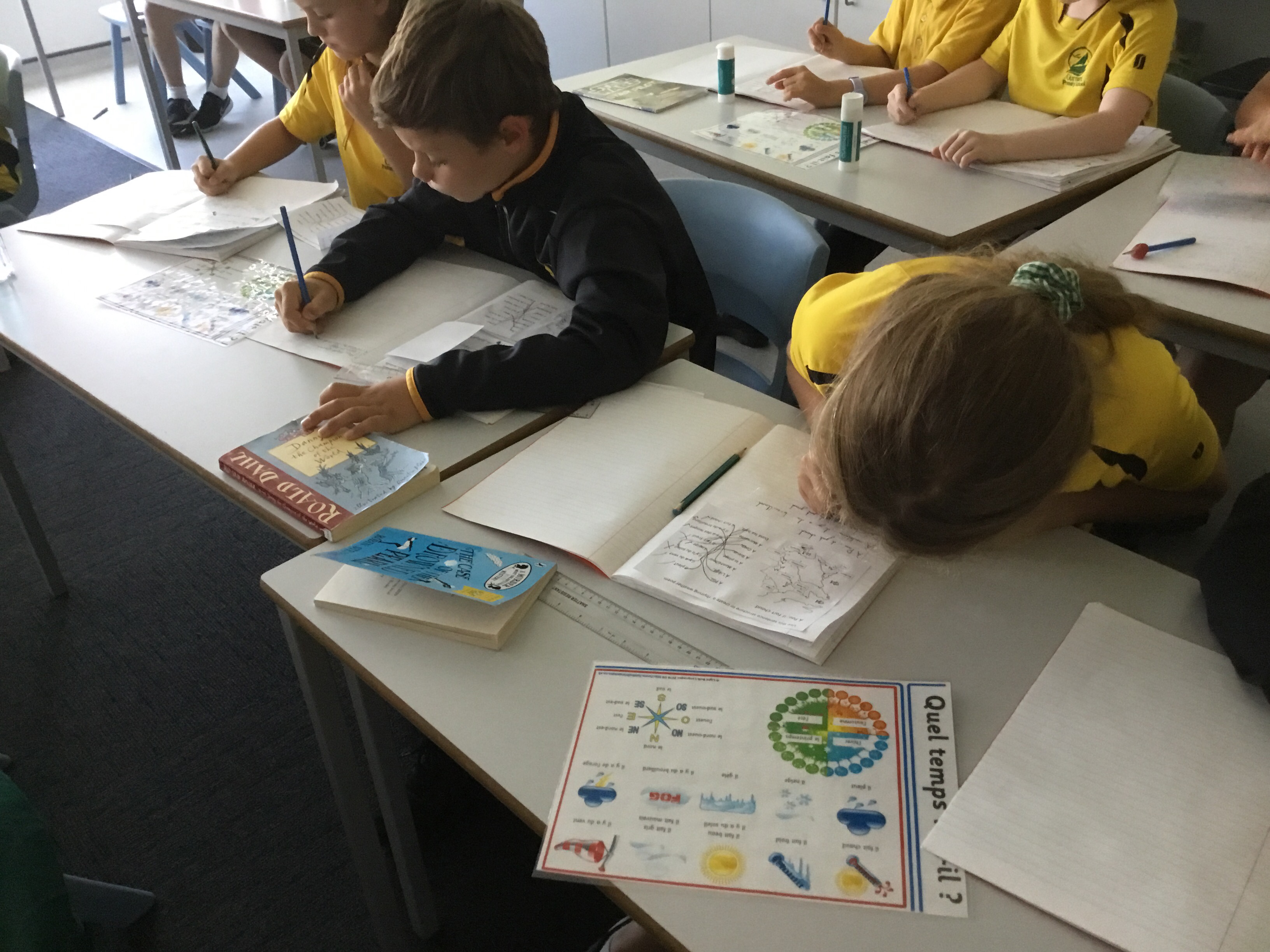 Year 4 practised numbers up to 40. They then learnt how to say the temperature using the French word for degrees and for minus temperatures. They then looked at a map of France, reading and then writing some sentences stating what the weather was like and what the temperature was using a given sentence structure.